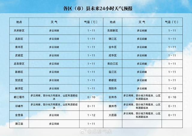 成都市气象台发布最新消息,预计未来三天我市以多云天气为主,最高气温12℃→13℃→14℃。其中今天晚上到明日白天西部部分地方有霜冻,山区易出现道路结冰,驾车出行需注意~后两日,整体气温略有回升,晴好天气适合户外活动。提醒小伙伴们,前期低温仍有残留,早晚寒意明显,温差较大,三日最低气温分别为0℃→1℃→3℃,出行需做好保暖。明天就是周日啦,小伙伴们计划去哪玩儿呢?