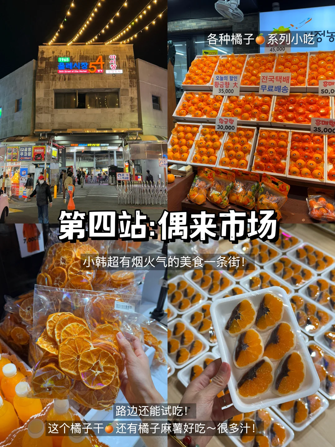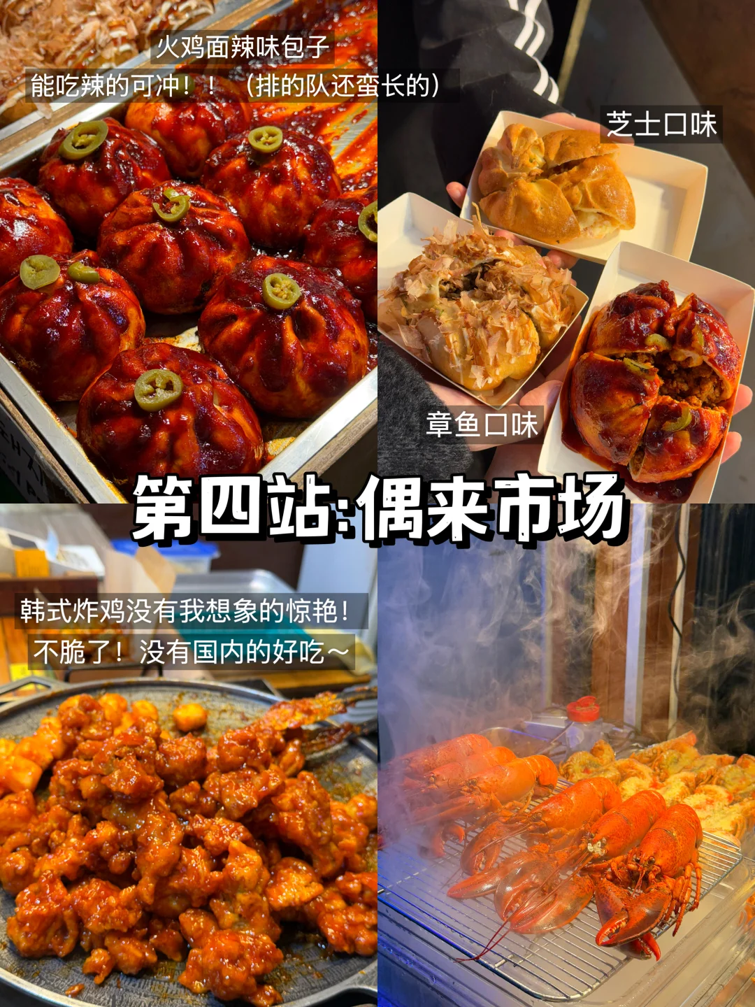 来市场记得先换好零钱,大部分摊位还是现金哦~推荐韩式火鸡面辣味包子!还有橘子麻薯🍊好看又好吃~和国内小吃街差不多很热闹