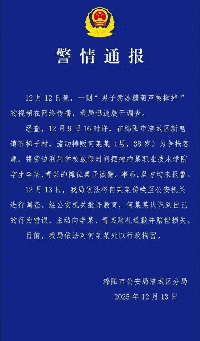12月12日晚,一则“男子卖冰糖葫芦被掀摊”的视频在网络传播,我局迅速展开调查。