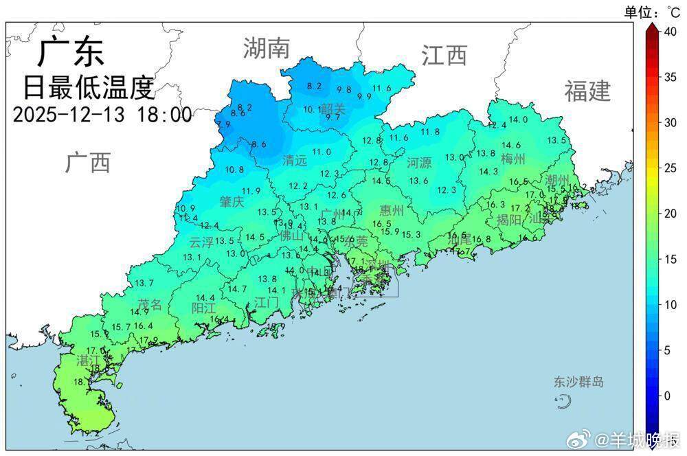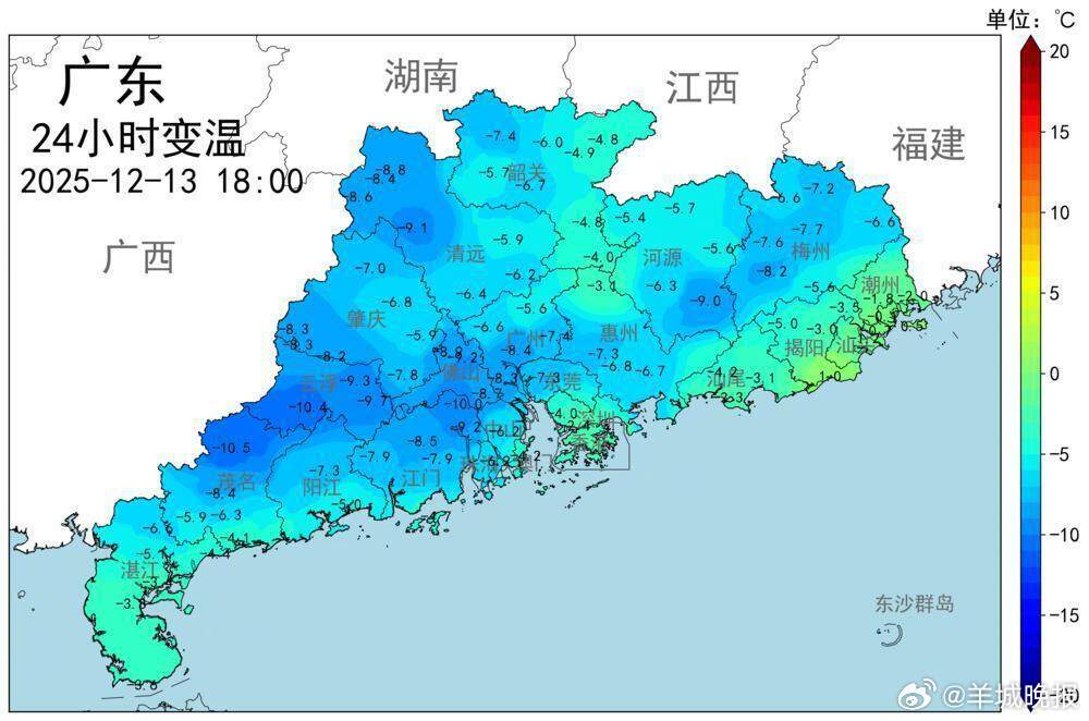 【#广东局地同比降温超10度#14日或15日早晨迎过程最低气温】12月13日白天,中等偏强冷空气自北向南影响广东大部。截至13日傍晚,除东南沿海局地外,广东大部分国家基本气象站已录得24小时同比降温,部分国家基本气象站同比降温超10℃。广东省气象部门预计,14日或15日早晨,广东各地将迎本轮冷空气影响下的过程最低气温。预计15日白天起,广东气温逐步回升。广东局地同比降温超10℃!14日或15日早晨迎过程最低气温([原创]记者:梁怿韬;编辑:惠天骄;审签:周乐瑞)