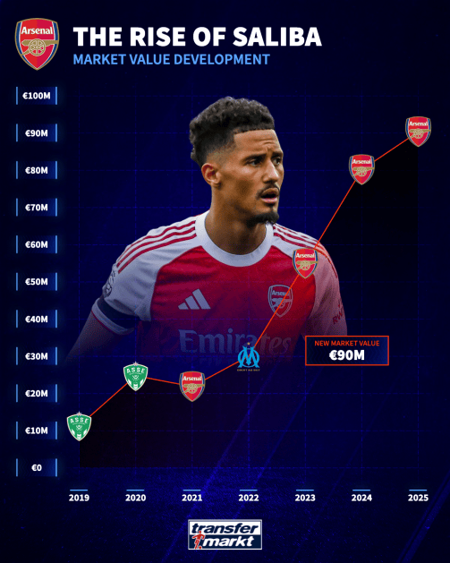 虎扑12月13日讯德国转会市场(Transfermarkt)更新并盘点了全球后卫最新身价情况:阿森纳中卫萨利巴在最新英超身价更新中上涨1000万欧,达到9000万欧,成为目前足坛身价最高的后卫。