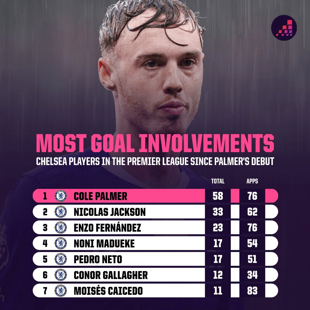 数据显示,自帕尔默完成切尔西首秀以来,他在联赛为切尔西直接参与进球数已达58次(76场),是队内同期最多。其后依次为杰克逊33次(62场)、恩佐23次(76场)、马杜埃凯17次(54场)、内托17次(51场)等。