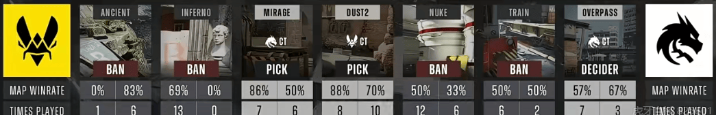 虎扑12月14日讯布达佩斯Major半决赛,Spirit对阵Vitality地图BP: