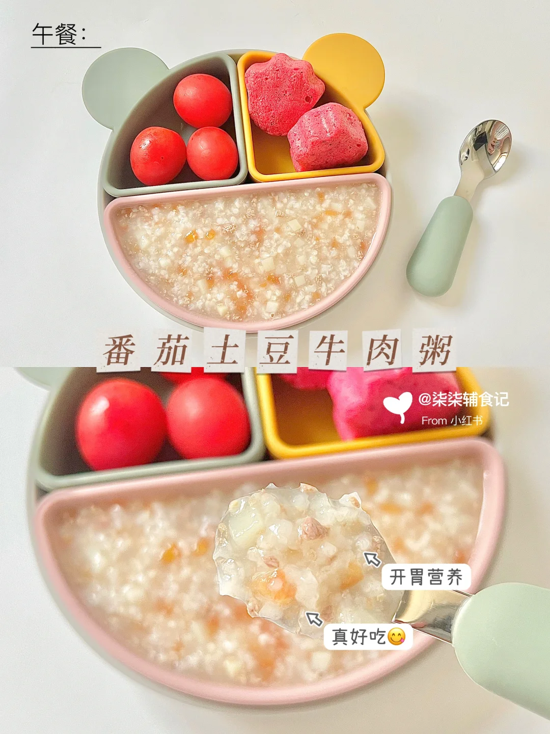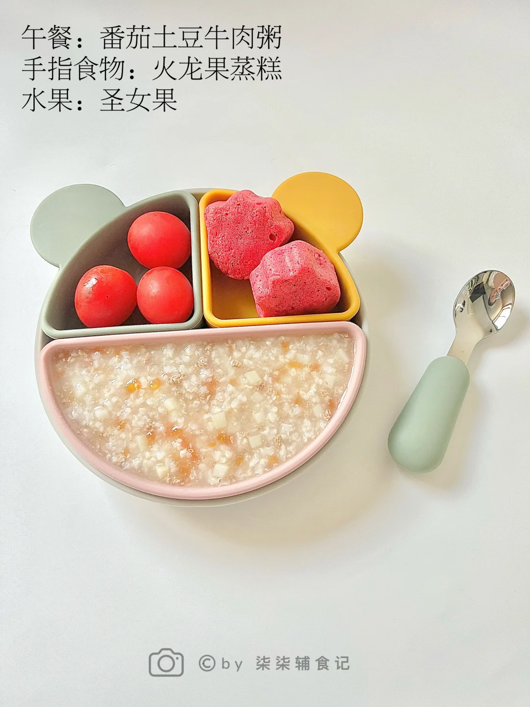 午餐番茄土豆牛肉粥和火龙果蒸糕,之前有人给我留言说番茄土豆不能一起吃…说是吃了会产生大量盐酸,导致不消化…………