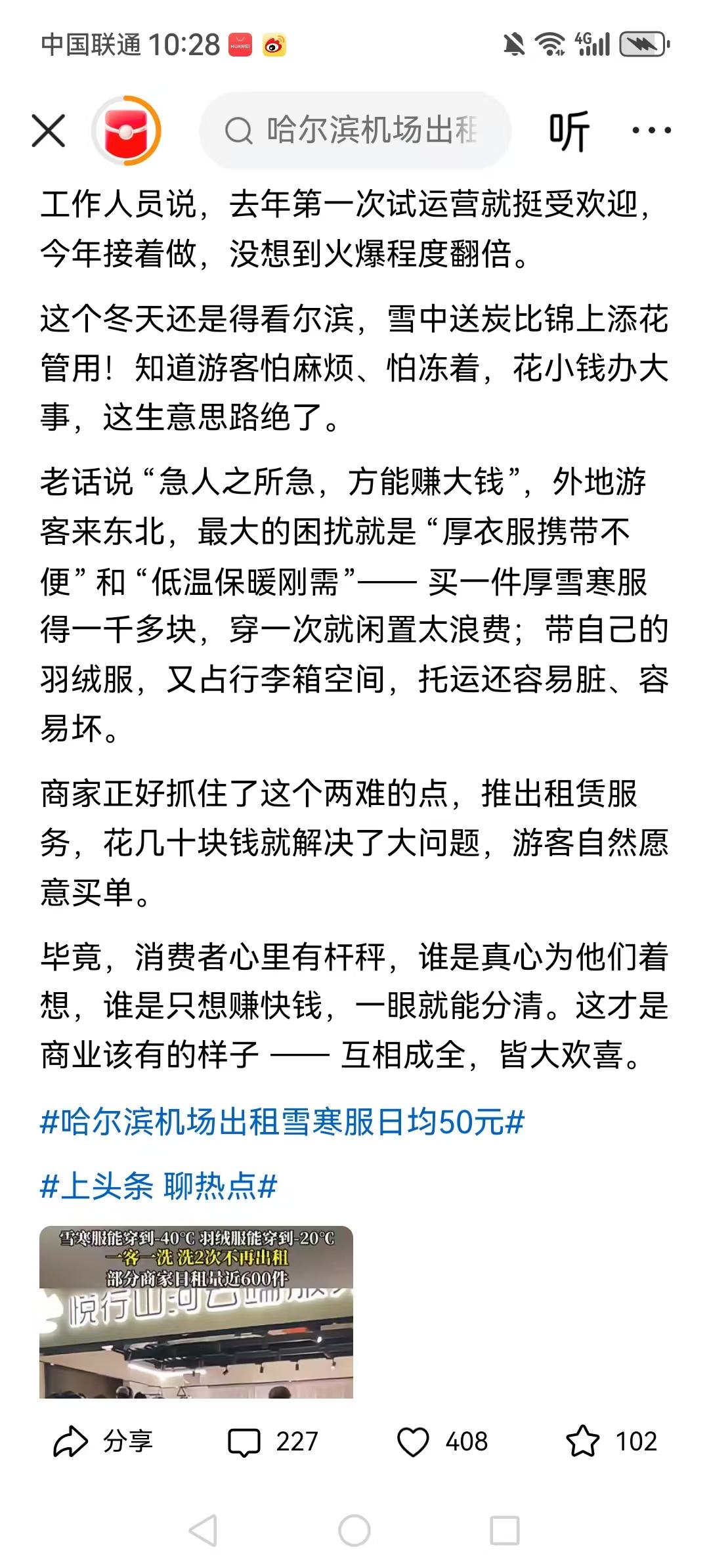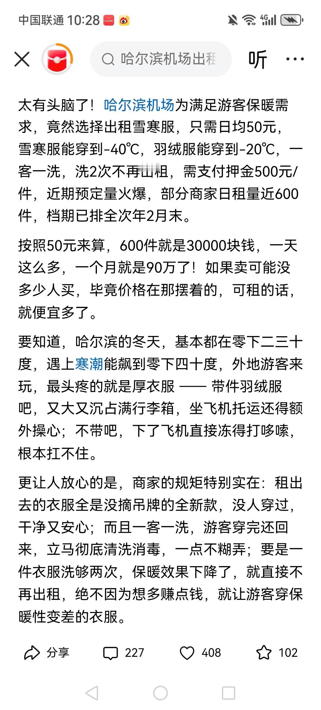 哈尔滨机场为满足游客保暖需求,竟然选择出租雪寒服,只需日均50元。是我没看懂吗?