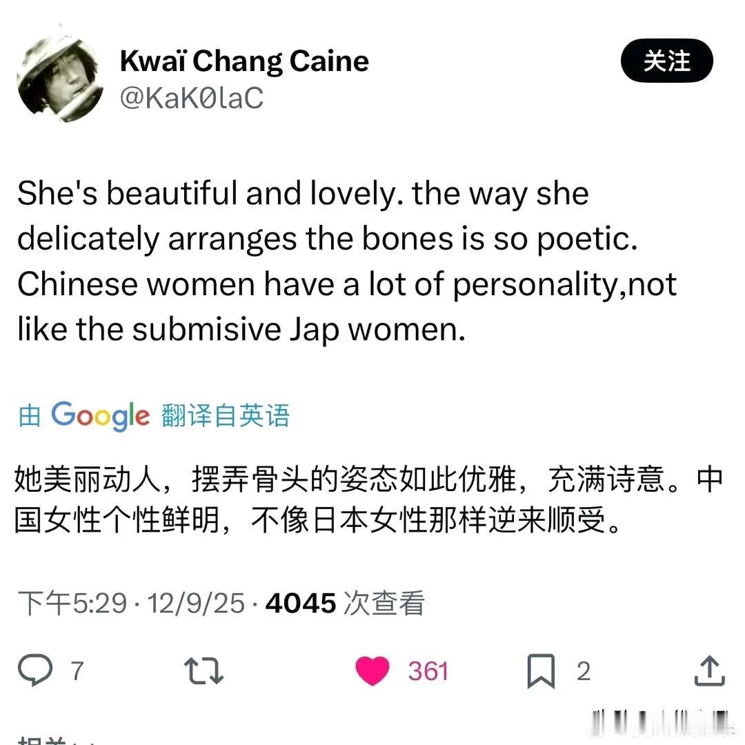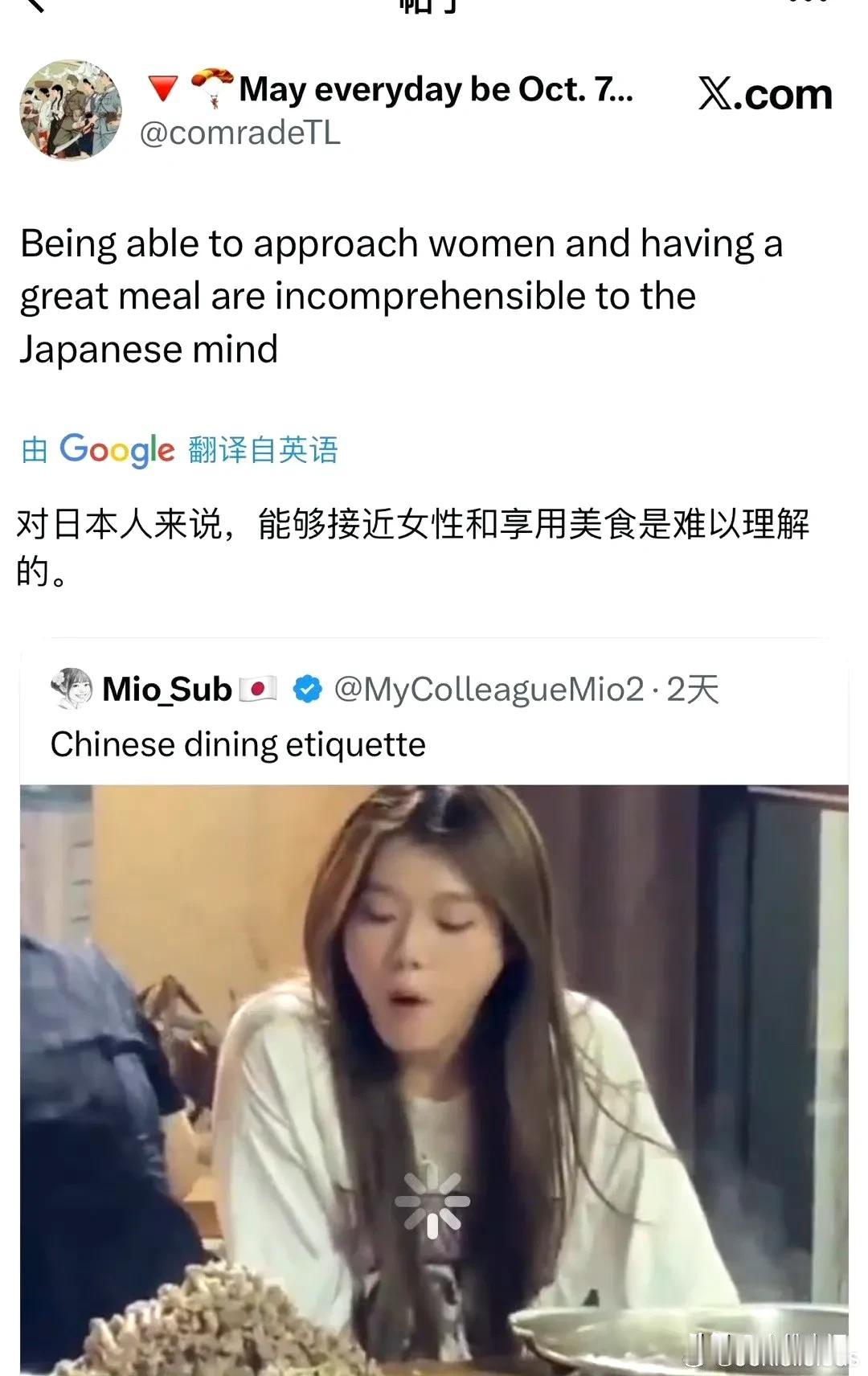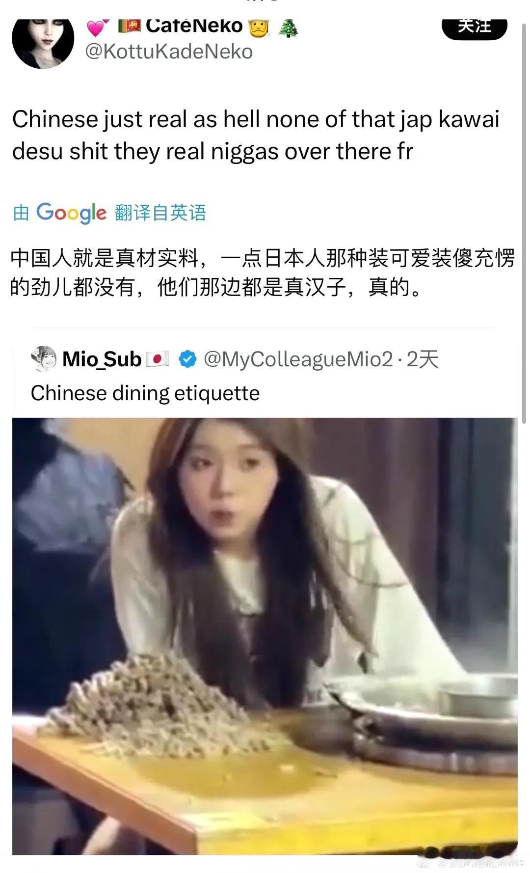 日本人发中国女生吃饭吐骨头在桌上的视频,然后阴阳怪气地说这就是中国人的餐桌礼仪!结果被各国网友排队教育,外国网友称中国女孩的真实,没有日本人那么装,中国人直来直去,一点都没有日本人那种装傻充愣的劲儿,日本人虚伪,装得好像很有礼貌很有素质,完全理解不了中国人这种轻松自在!这个日本人偷鸡不成蚀把米,以为整个世界都跟它们一样装,结果被失算了,大家还是更喜欢中国人的直爽,不喜欢日本的那种虚伪!