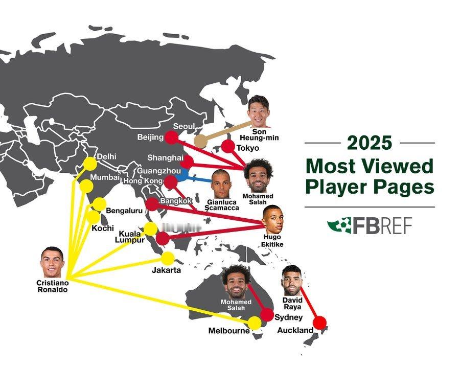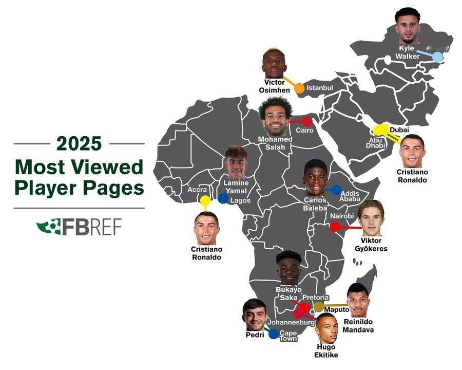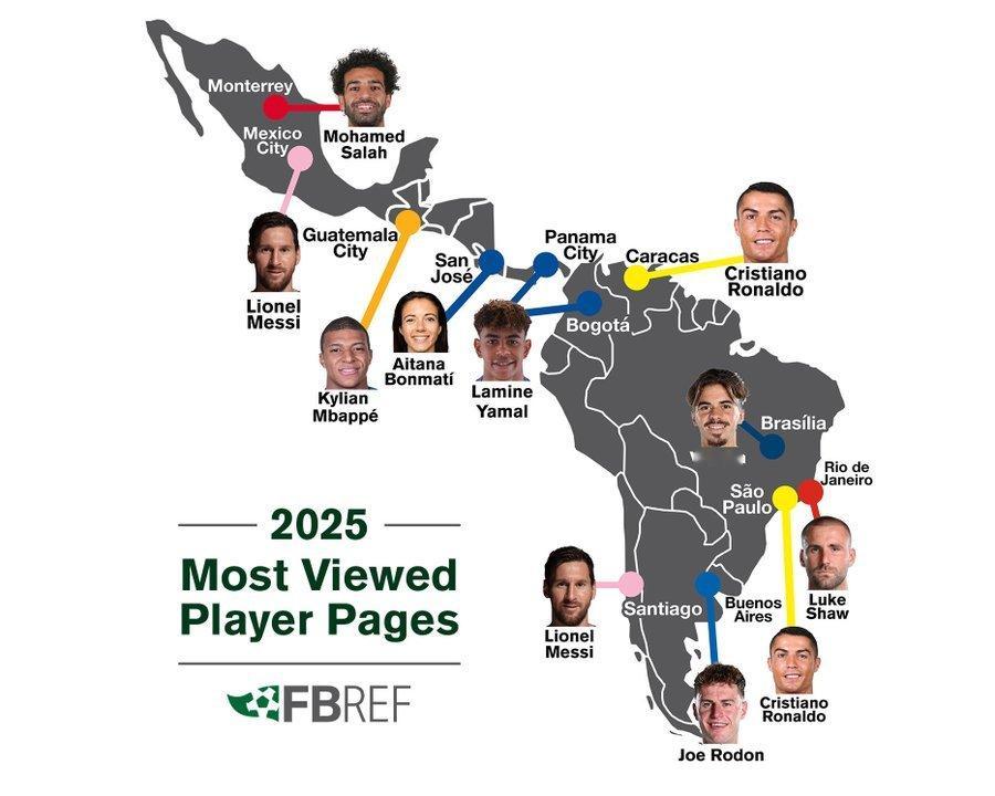 C罗 据Fbref 提供地图信息C 罗成为全美浏览量最高的球员