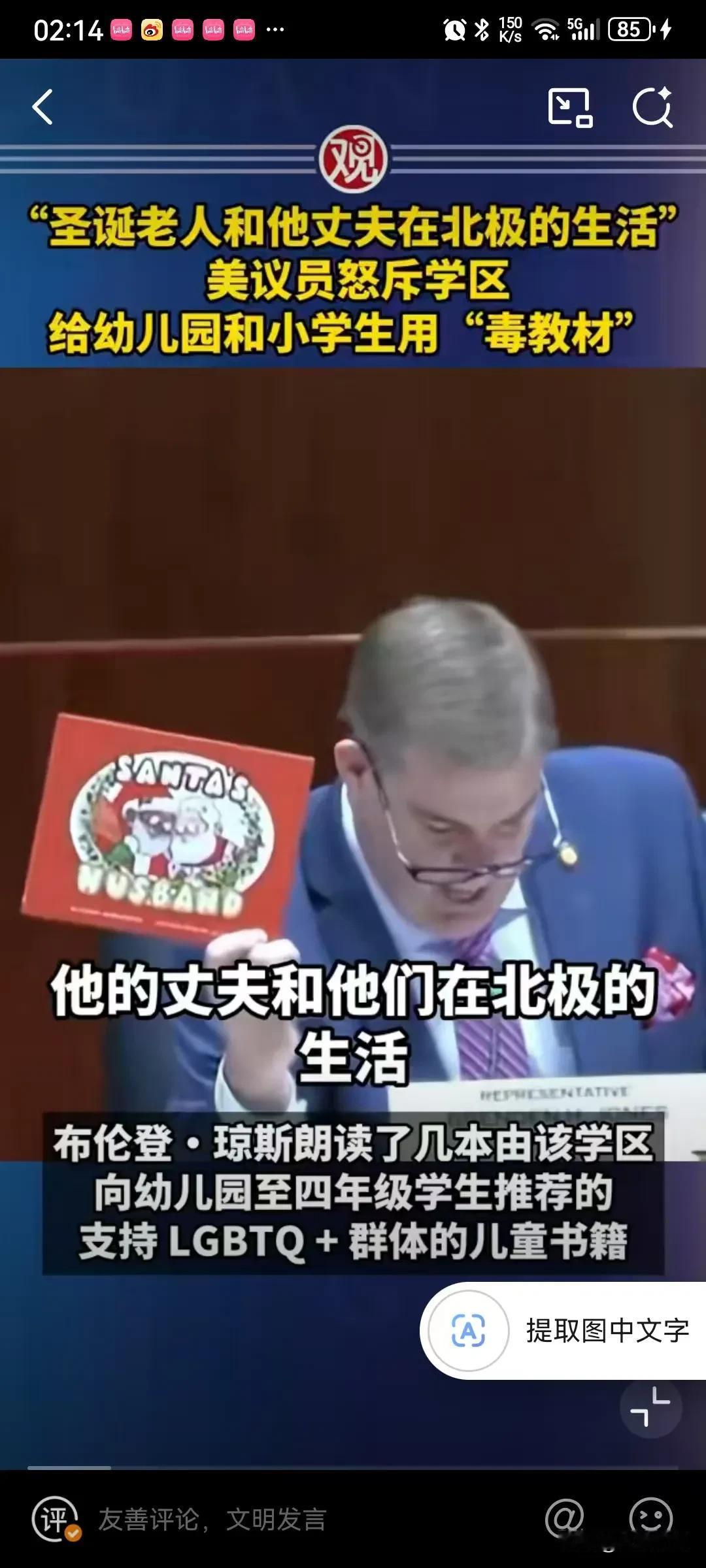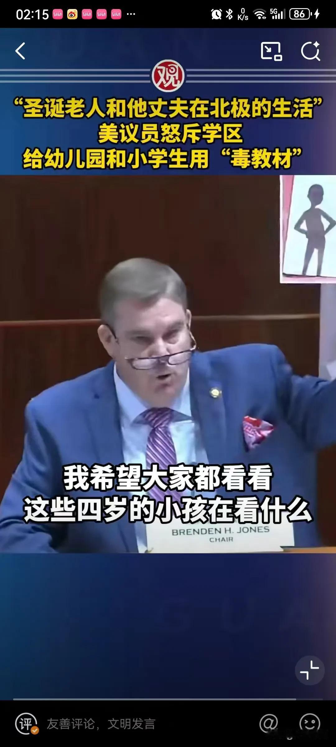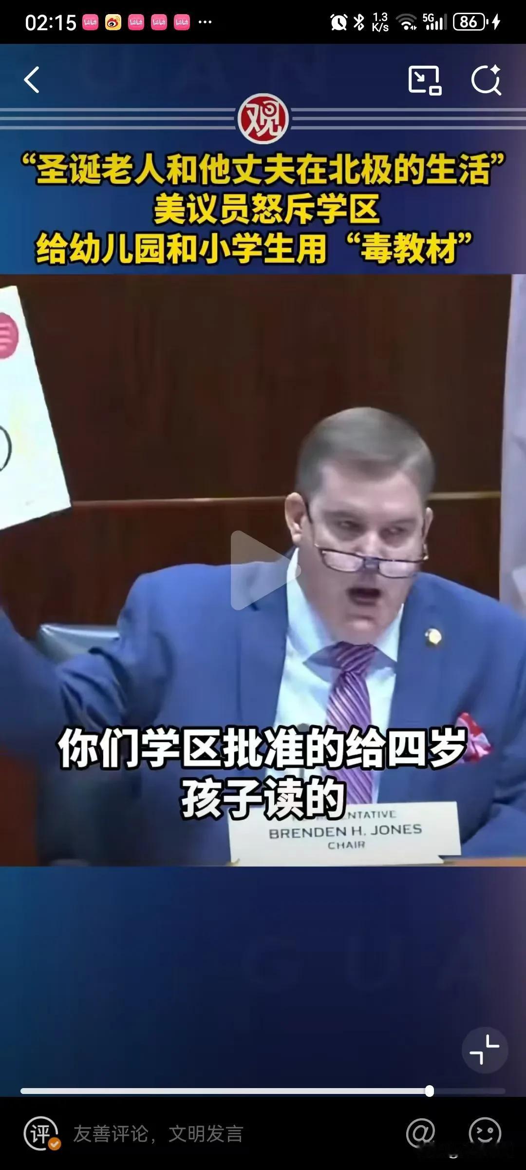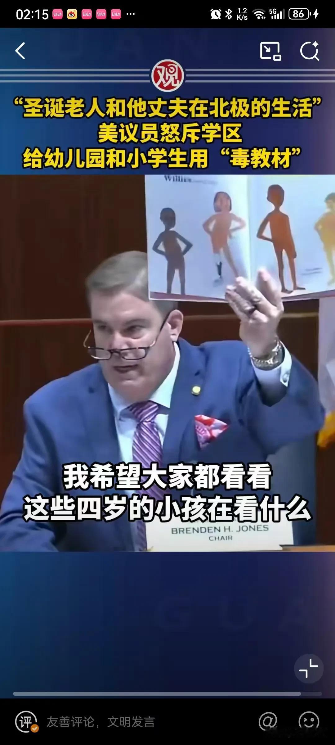 美国也有毒教材,美国议员发现幼儿园和小学存在大量毒教材,什么《圣诞老人的丈夫》,讲述圣诞老人和它的丈夫在北极的生活,还有各种性别自由选择的书,甚至给四岁的幼儿园学生看含有裸体书,教幼儿园学生说小孩裸奔不粗鲁,让这个美国议员都抓狂了,直言这些书就是垃圾! 其实这是美国白左化的后果,这些白左的群体从教育切入,就是从小培养美国学生接受它们那套荒唐的白左思想,虽然川普上来有所清楚,但是之前已经渗透得太深了,一时半会也清楚不干净,我们这边真的要吸取这种教训!