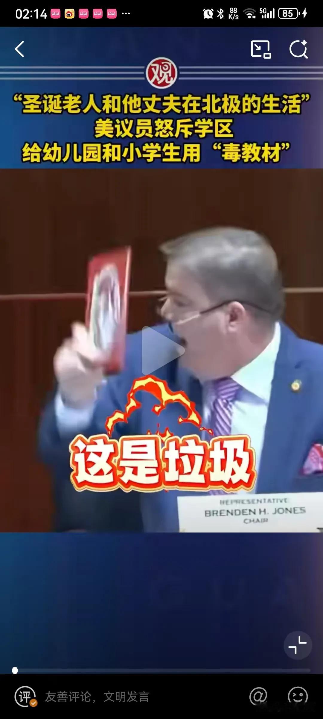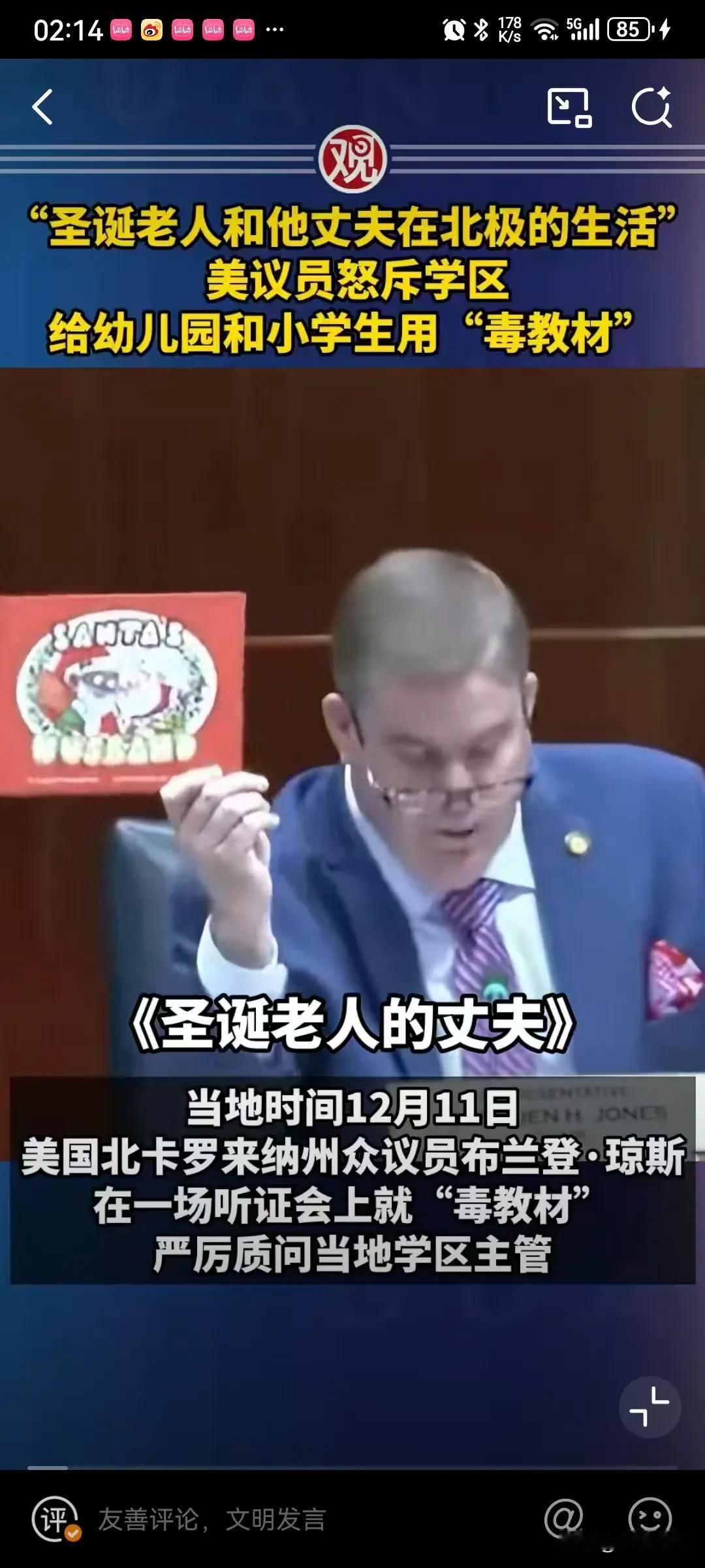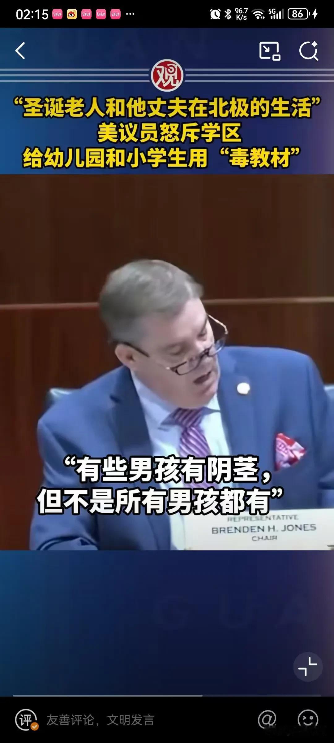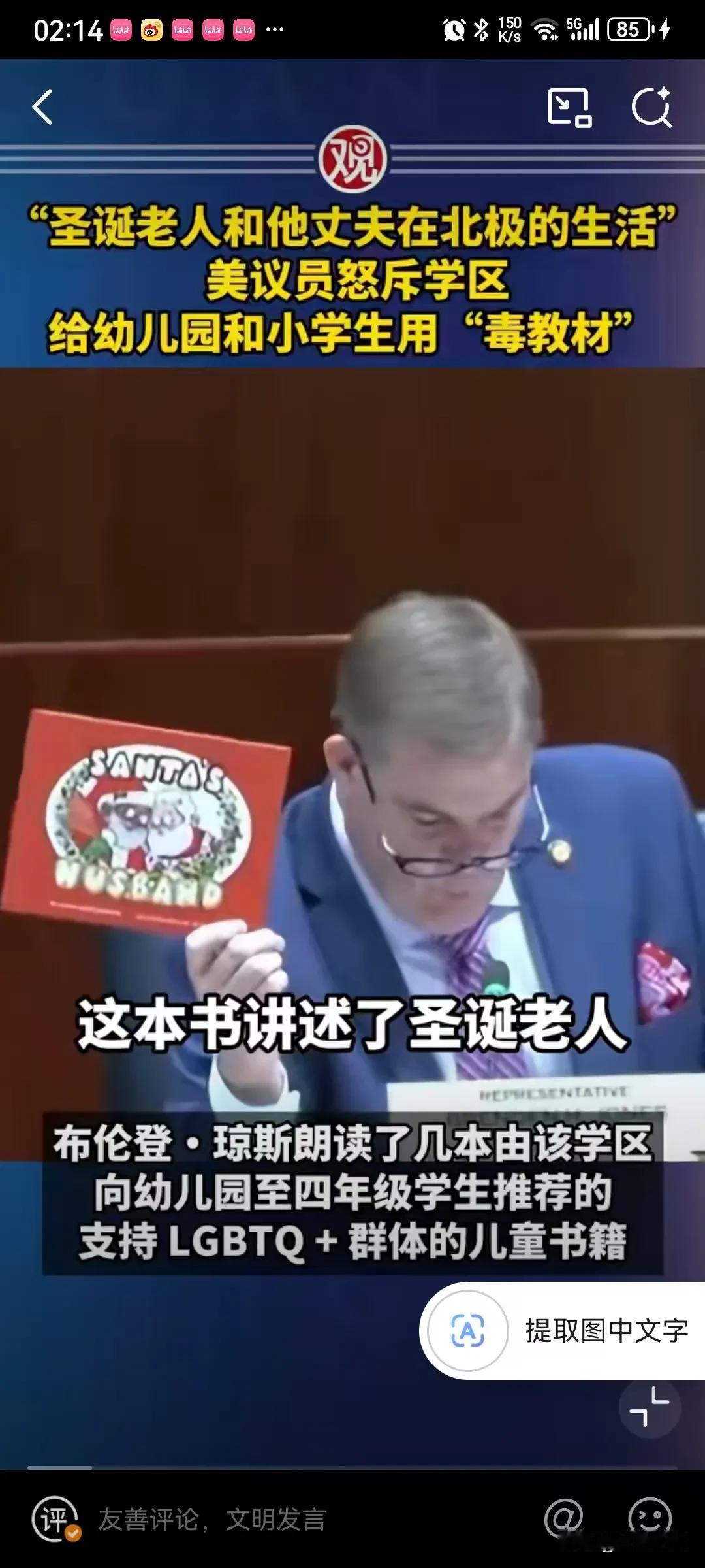 美国也有毒教材,美国议员发现幼儿园和小学存在大量毒教材,什么《圣诞老人的丈夫》,讲述圣诞老人和它的丈夫在北极的生活,还有各种性别自由选择的书,甚至给四岁的幼儿园学生看含有裸体书,教幼儿园学生说小孩裸奔不粗鲁,让这个美国议员都抓狂了,直言这些书就是垃圾! 其实这是美国白左化的后果,这些白左的群体从教育切入,就是从小培养美国学生接受它们那套荒唐的白左思想,虽然川普上来有所清楚,但是之前已经渗透得太深了,一时半会也清楚不干净,我们这边真的要吸取这种教训!
