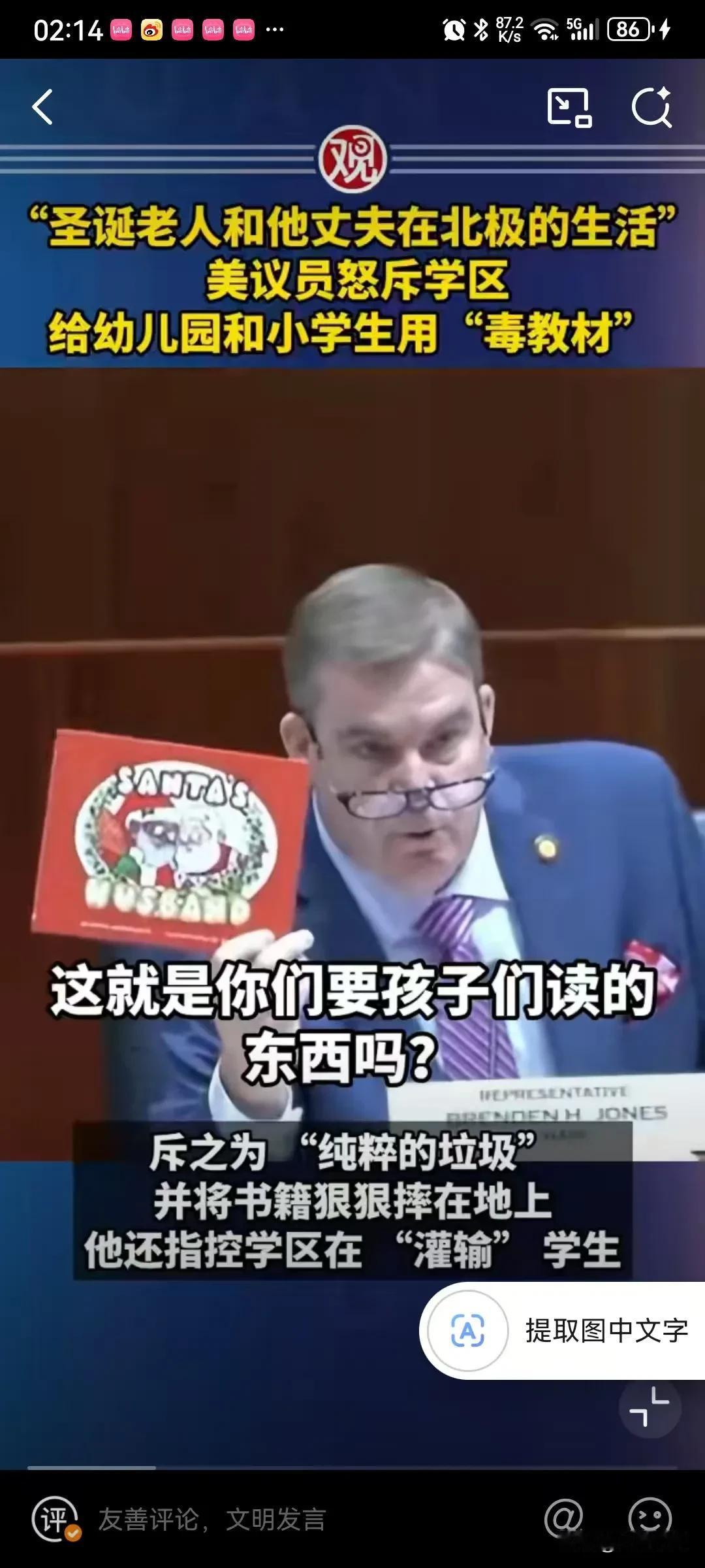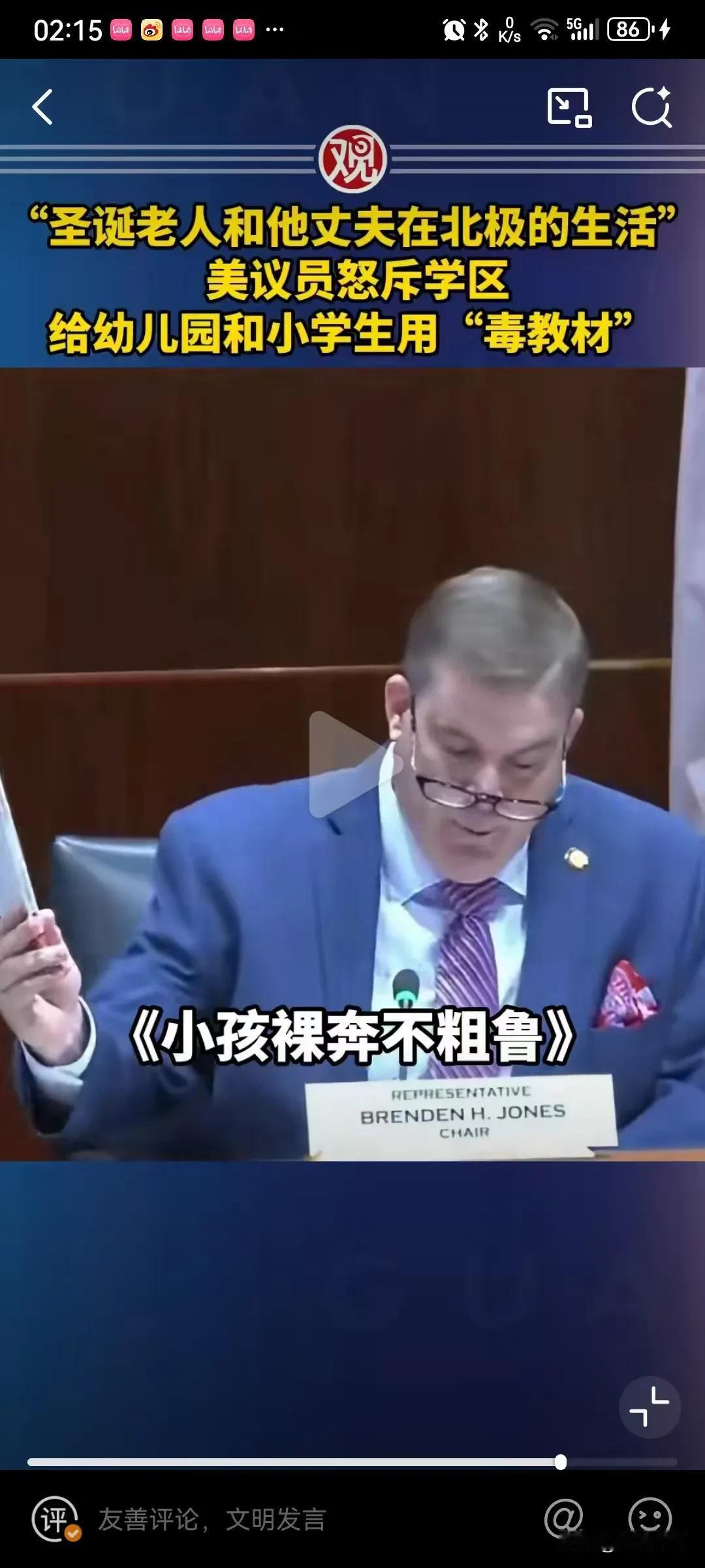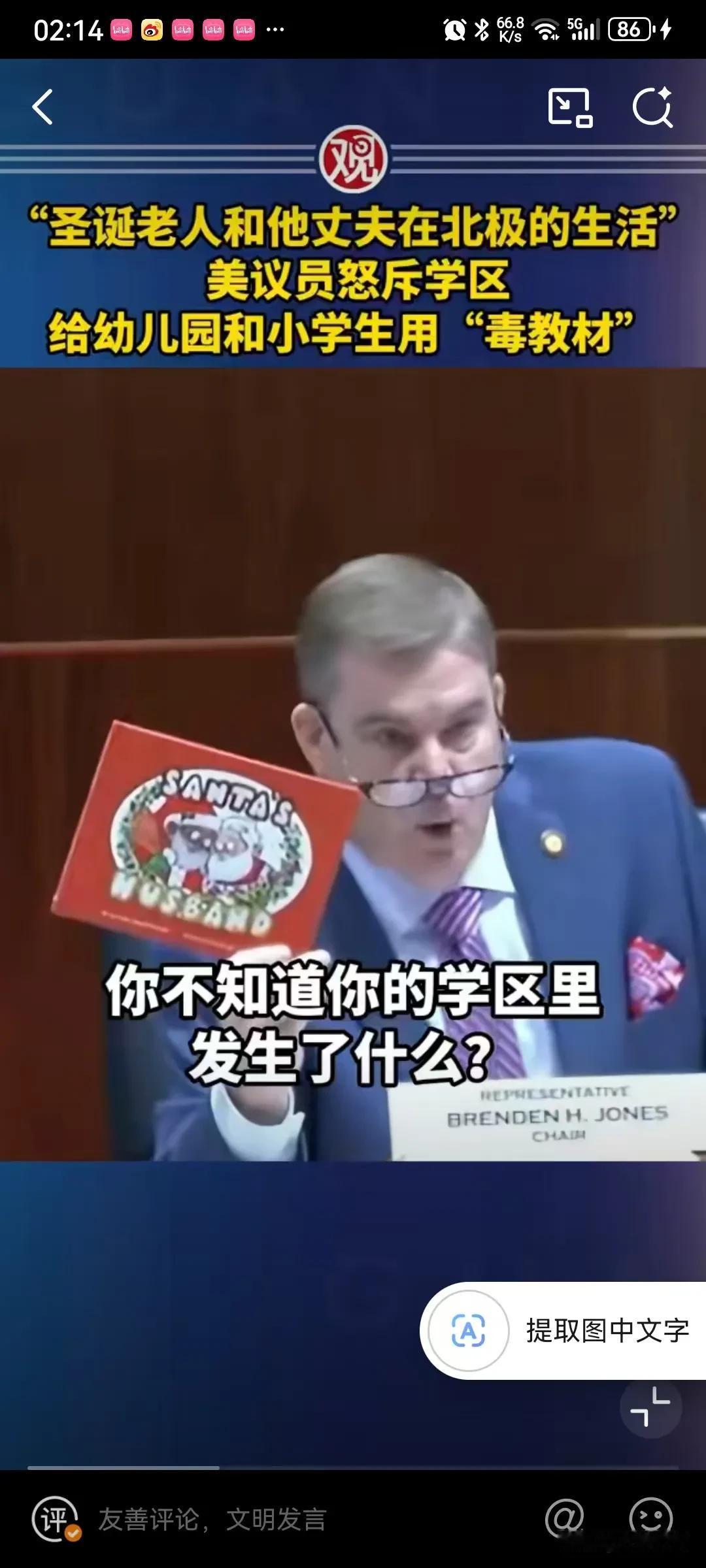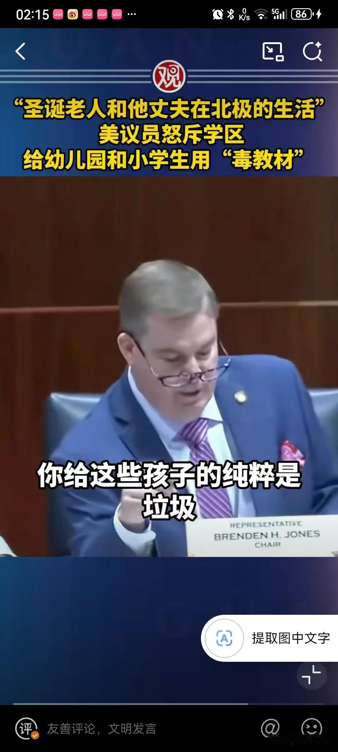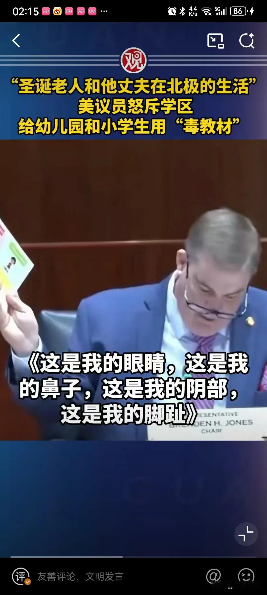 美国也有毒教材,美国议员发现幼儿园和小学存在大量毒教材,什么《圣诞老人的丈夫》,讲述圣诞老人和它的丈夫在北极的生活,还有各种性别自由选择的书,甚至给四岁的幼儿园学生看含有裸体书,教幼儿园学生说小孩裸奔不粗鲁,让这个美国议员都抓狂了,直言这些书就是垃圾! 其实这是美国白左化的后果,这些白左的群体从教育切入,就是从小培养美国学生接受它们那套荒唐的白左思想,虽然川普上来有所清楚,但是之前已经渗透得太深了,一时半会也清楚不干净,我们这边真的要吸取这种教训!