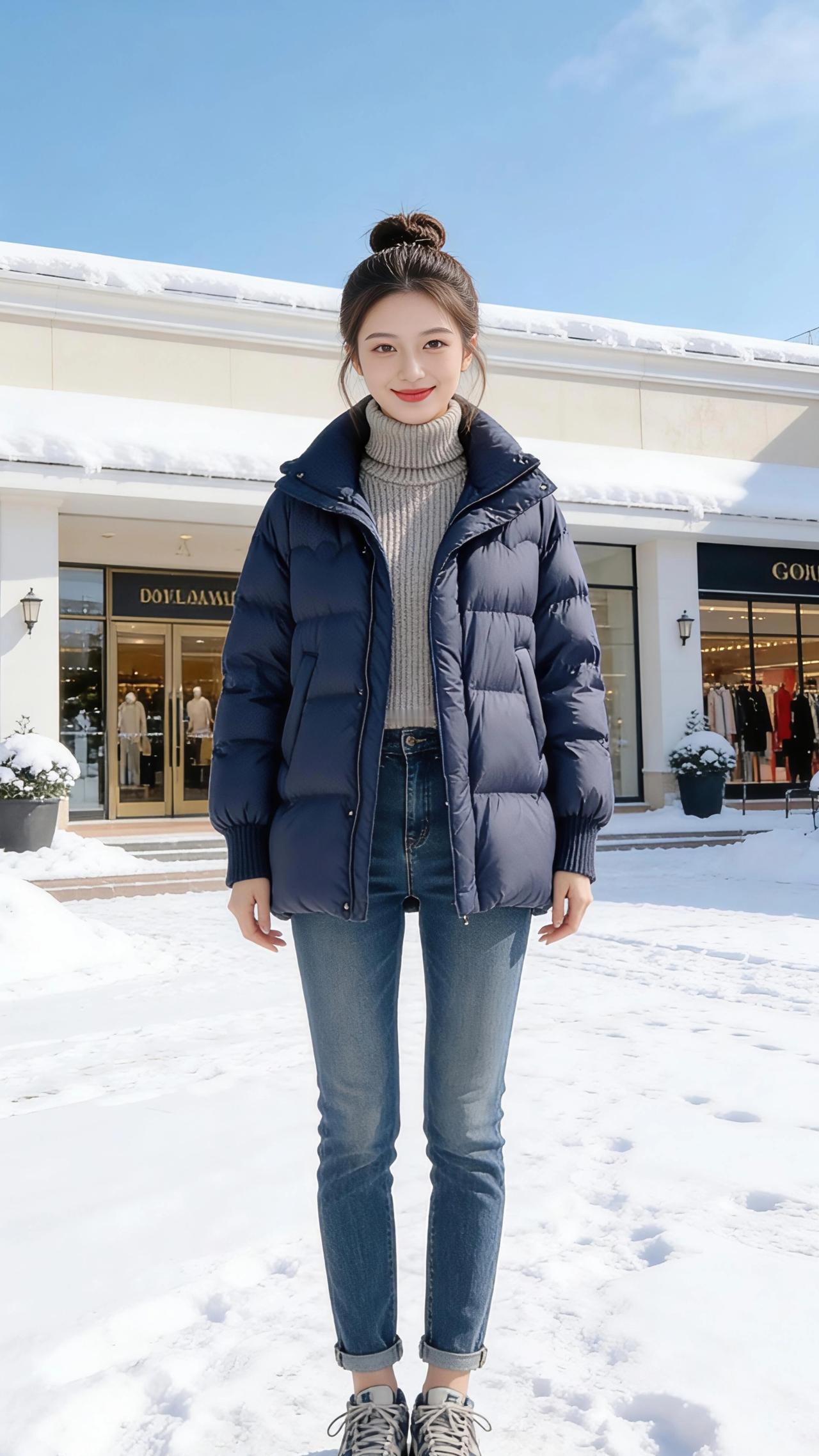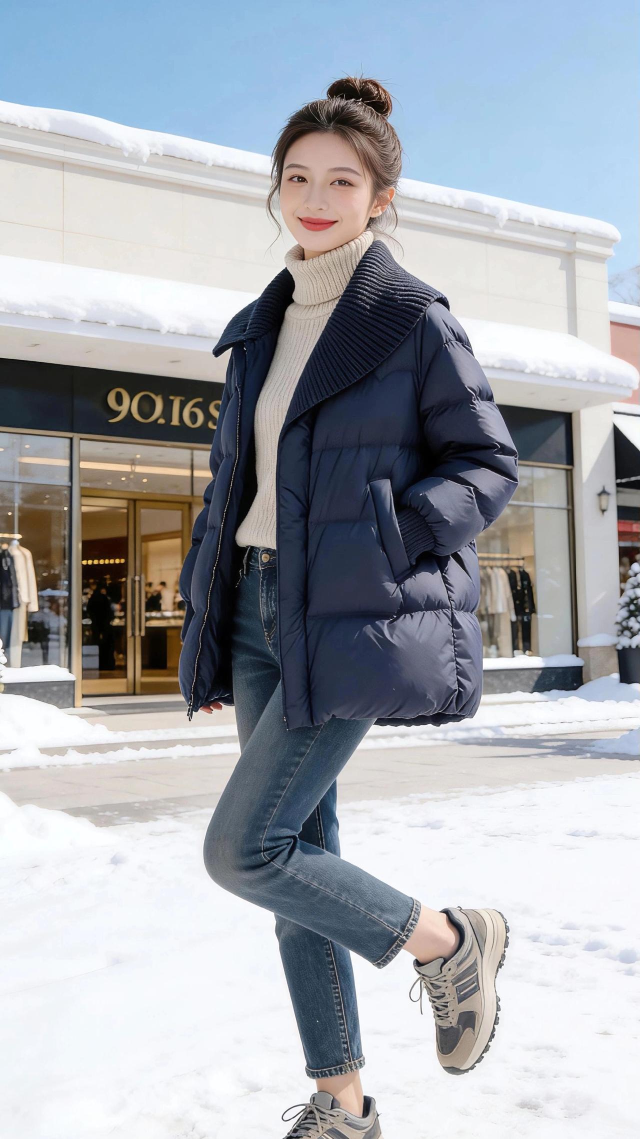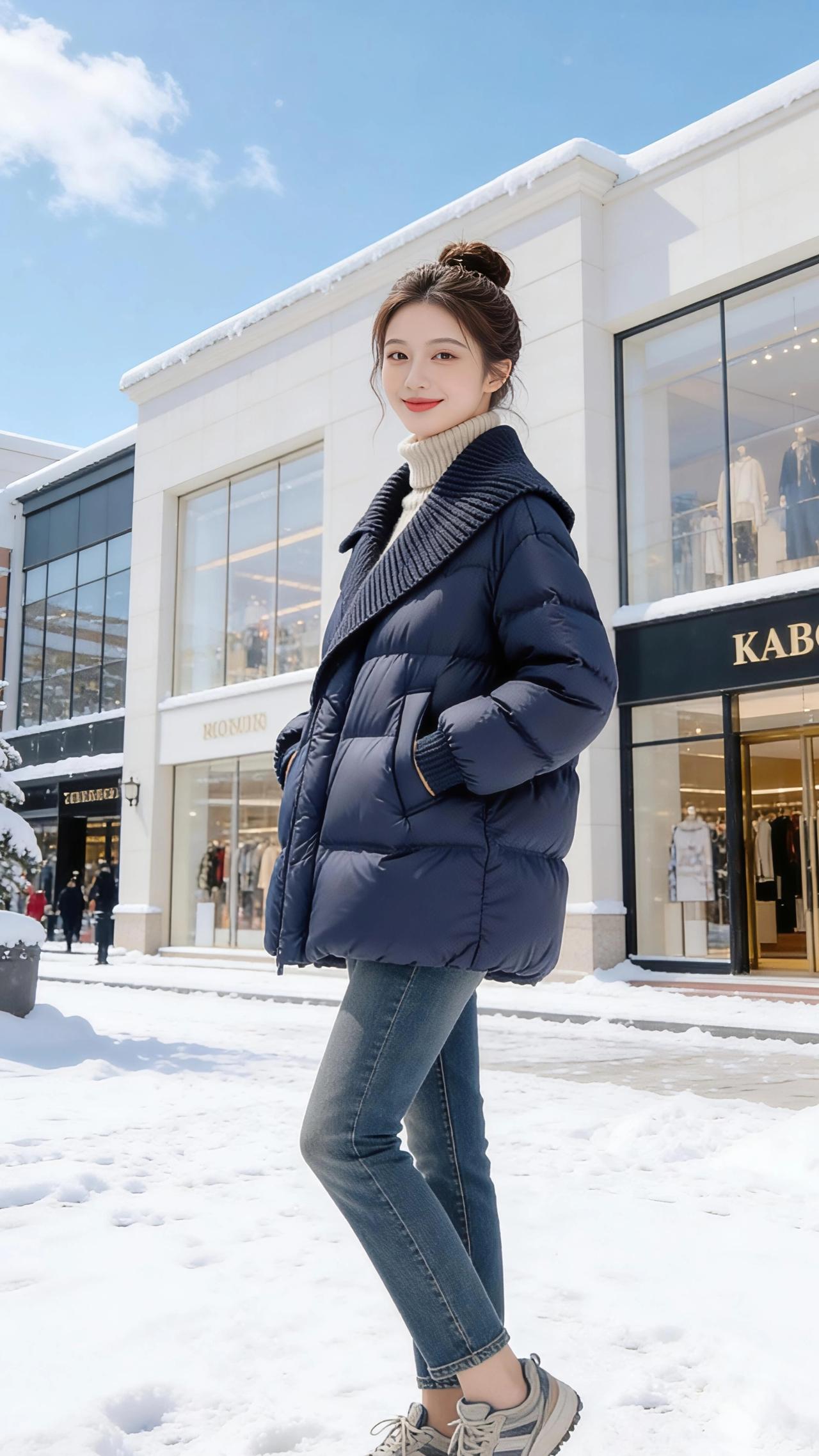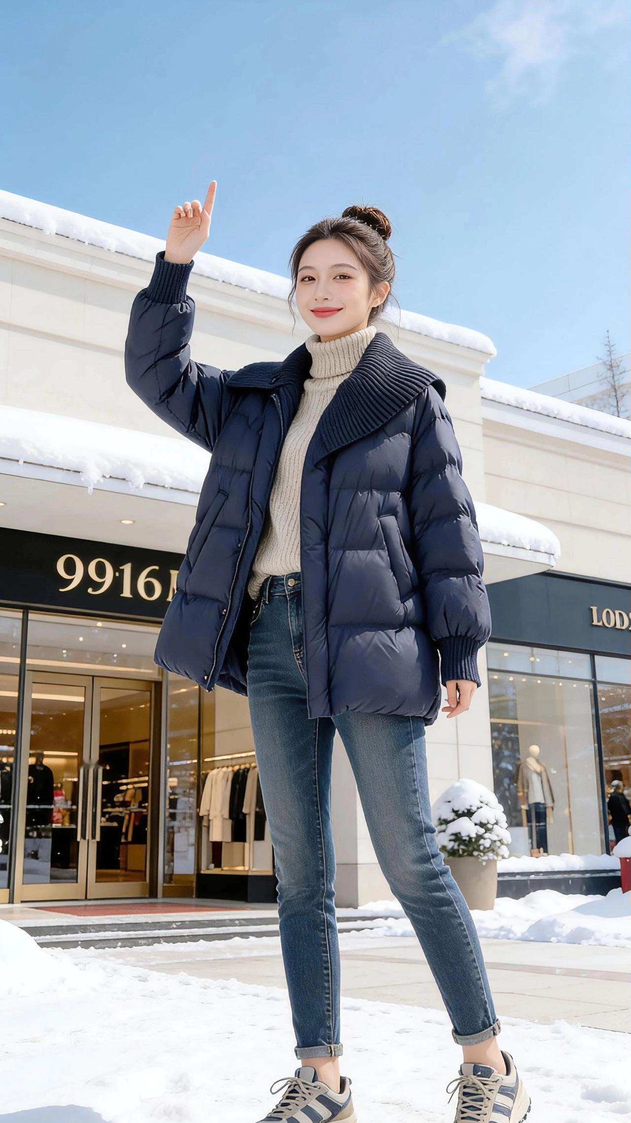 雪日霓裳 冬阳破开云层,将碎金般的光洒在覆雪的高档商场门廊,檐角的积雪被晒得微微发亮,像撒了一把细盐。 少女立在雪地上,藏青色羽绒服的针织大翻领温柔地裹着脖颈,蓬松的菱格纹路兜住了冬日的暖意,却又在袖口与衣摆处留了随性的松弛感。她将棕色长发挽成丸子头,几缕碎发被风拂在颊边,浅红的唇瓣弯起时,像雪地里绽开的一枝梅,明亮的眼妆衬得眼眸如浸了暖阳的湖水,漾着温柔的光。 她单脚轻点雪地,手插在羽绒服口袋里,牛仔裤勾勒出纤细的腿线,运动鞋的灰调与雪景相融,却又在抬手指向天空的刹那,添了几分鲜活的俏皮。指尖戳向澄澈的蓝天时,她回眸望向镜头,笑容漫开,像融了雪的溪流,清软又明媚。 伸手轻拢衣领的瞬间,针织纹理摩挲过指尖,羽绒服的蓬松将她裹在温柔的暖意里,与身侧皑皑的雪、锃亮的橱窗相映,成了冬日里最生动的风景。她忽而侧身,将重量倚在脚后跟上,雪粒从鞋边簌簌滑落,而那藏青色的羽绒服在雪色里,似一块温润的墨玉,衬得她肌肤胜雪,身姿高挑。 风掠过商场的玻璃幕墙,带起她发间的碎影,她站在这片雪与光的交织里,羽绒服的暖意、牛仔裤的随性、运动鞋的轻快,都揉进了冬阳的温柔里,成了一首关于冬日与美好的短诗。 高级感穿搭