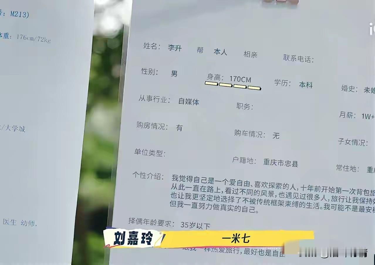 刘嘉玲在重庆相亲市场做节目, 就是帮助女生找对象, 现场的大爷大妈, 看到她来了, 还以为是她来相亲, 纷纷上前将她围住, 问她的家庭情况, 这都把她逗笑了, 不过大家这么热情, 让她觉得自己好年轻, 直到她说明了要帮女生找对象, 大妈们这才拿出了许多男孩的资料, 看着身高170的男生, 刘嘉玲表示挺不错的, 奈何女孩的父亲不愿意, 表示170的男生太低了, 自己女儿就是170, 必须找一个比她高的, 刘嘉玲觉得男人有责任心就行, 身高不是一个必要的条件, 奈何女生的父亲觉得身高是第一条件, 这就是父亲眼中的好女婿, 身高是第一位的, 至于工作家事世排在后面, 都说爱情难寻, 实际上是自己的条件太高了, 子女都不着急, 父母着急又有什么用? 自己的对象还需要自己操心, 又不是和父母去过, 自己和父母的眼光很难一样, 大家对于明星和普通人对对象的要求不同怎么看? 相亲交友 中老年相亲角 杭州大龄女相亲 重庆相亲 重庆相亲市场 重庆脱单相亲角