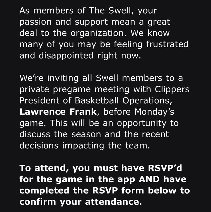 我们诚挚邀请所有TheSwell成员,在周二比赛前参加一场与快船篮球运营总裁劳伦斯-弗兰克的私密见面会。这将是一个讨论本赛季及近期影响球队决策的宝贵机会。