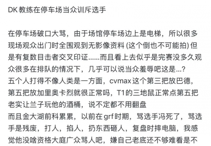 网友发帖:在惨遭让二追三后 教练cvmax疑似停车场当众训斥DK队员