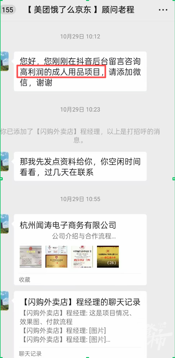 黄女士说,她很看好成人用品的销售前景,一直在了解这个项目,也正在找一些可以合作的销售渠道及商家。10月29日,她刷某短视频平台时跳出个“24小时成人用品无人售后”的链接,点进去留了自己的微信。很快一个名为“[美团饿了么京东]顾问老程”的微信发来消息添加她,10:12,您好,您刚刚在抖音后台留言咨询高利润的成人用品项目,请添加微信,谢谢。程先生是“杭州闻涛电子商务有限公司”(下文简称闻涛电子)的销售经理,加好友后向我发来了闻涛电子的介绍、合作流程,还有‘闪购外卖店’的情况、效果图及付款流程。