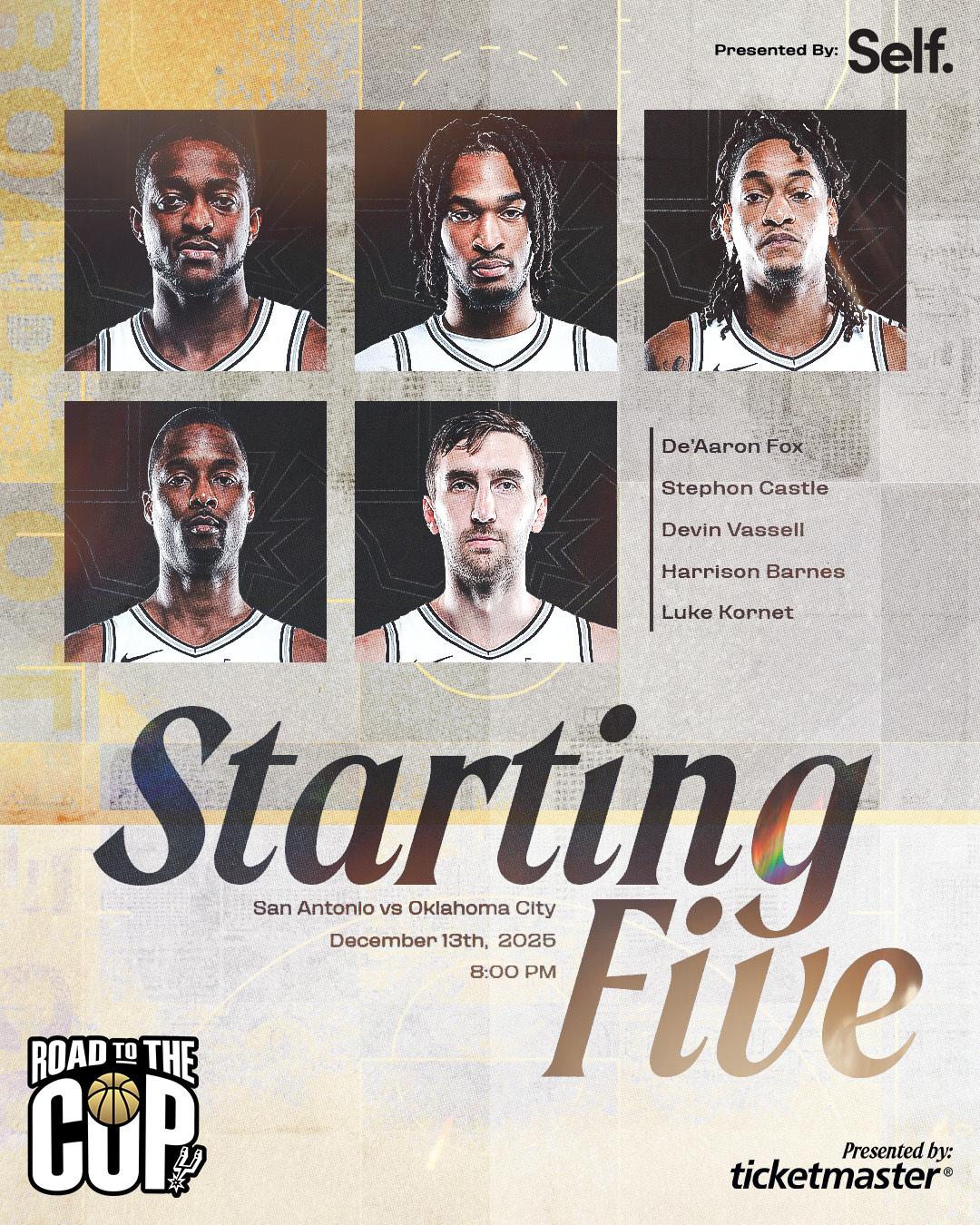 赛前,马刺社媒分享本场比赛的首发球员:哈里森-巴恩斯、斯蒂芬-卡斯尔、达龙-福克斯、德文-瓦塞尔、卢克-科内特。