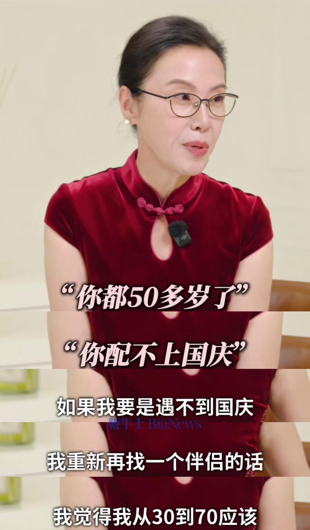 张丹红透露,自己的母亲曾说“你都50多岁了,配不上国庆”。对此,她坦言道“如果遇不到国庆,我的余地也很大,我觉得我从30岁到70岁的择偶范围都可以”。