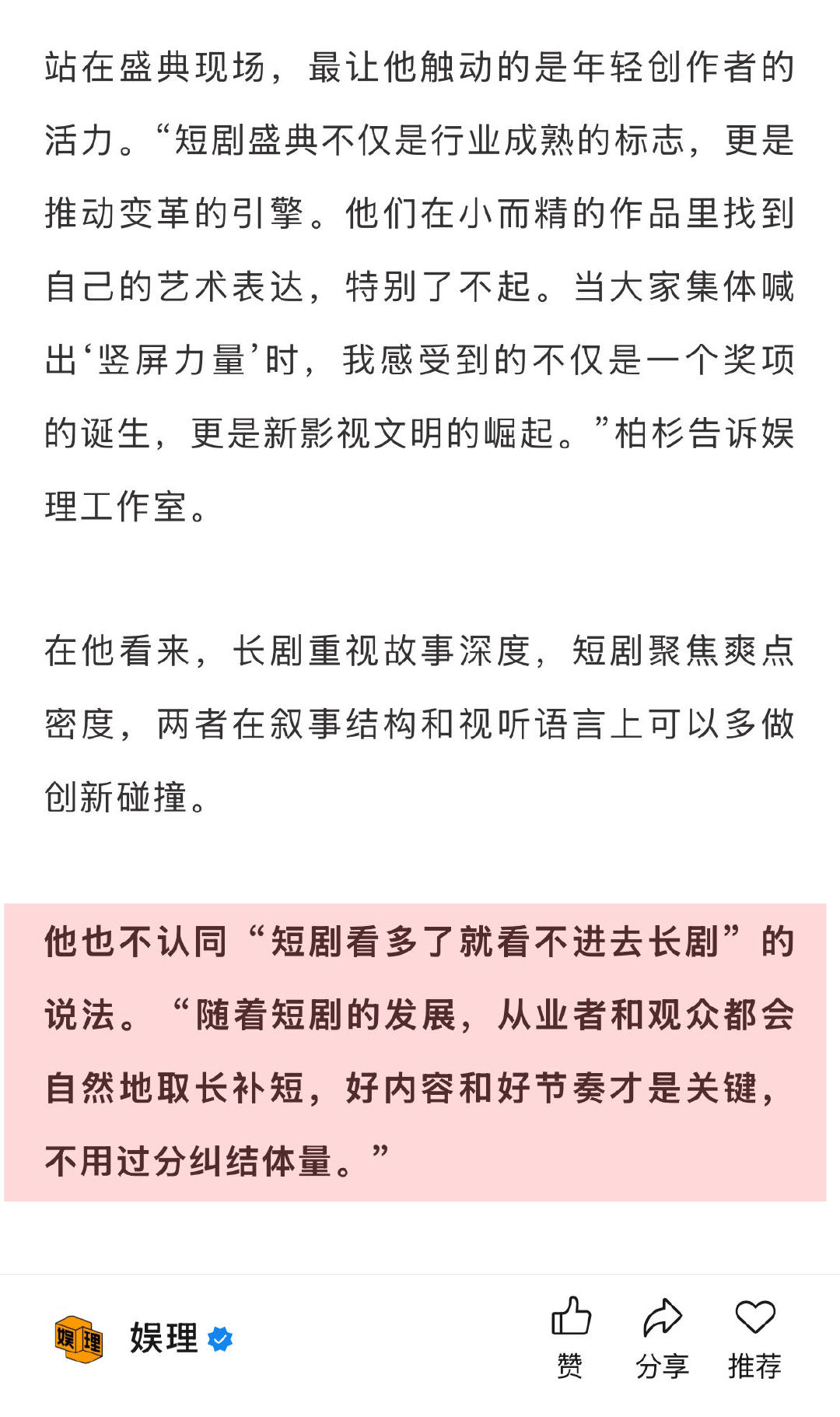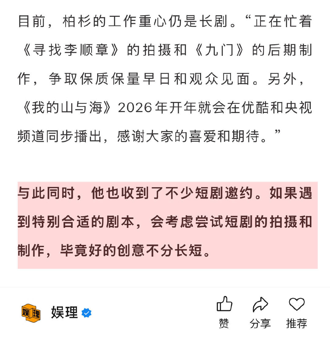 唐诡导演不认同短剧看多了就不看长剧 周星驰2022年就注意到了短剧 《唐朝诡事录》导演柏杉“正在忙着《寻找李顺章》的拍摄和《九门》的后期制作,争取保质保量早日和观众见面。另外,《我的山与海》2026年开年就会在优酷和央视频道同步播出,感谢大家的喜爱和期待。”与此同时,他也收到了不少短剧邀约。如果遇到特别合适的剧本,会考虑尝试短剧的拍摄和制作,毕竟好的创意不分长短…娱理独家↓