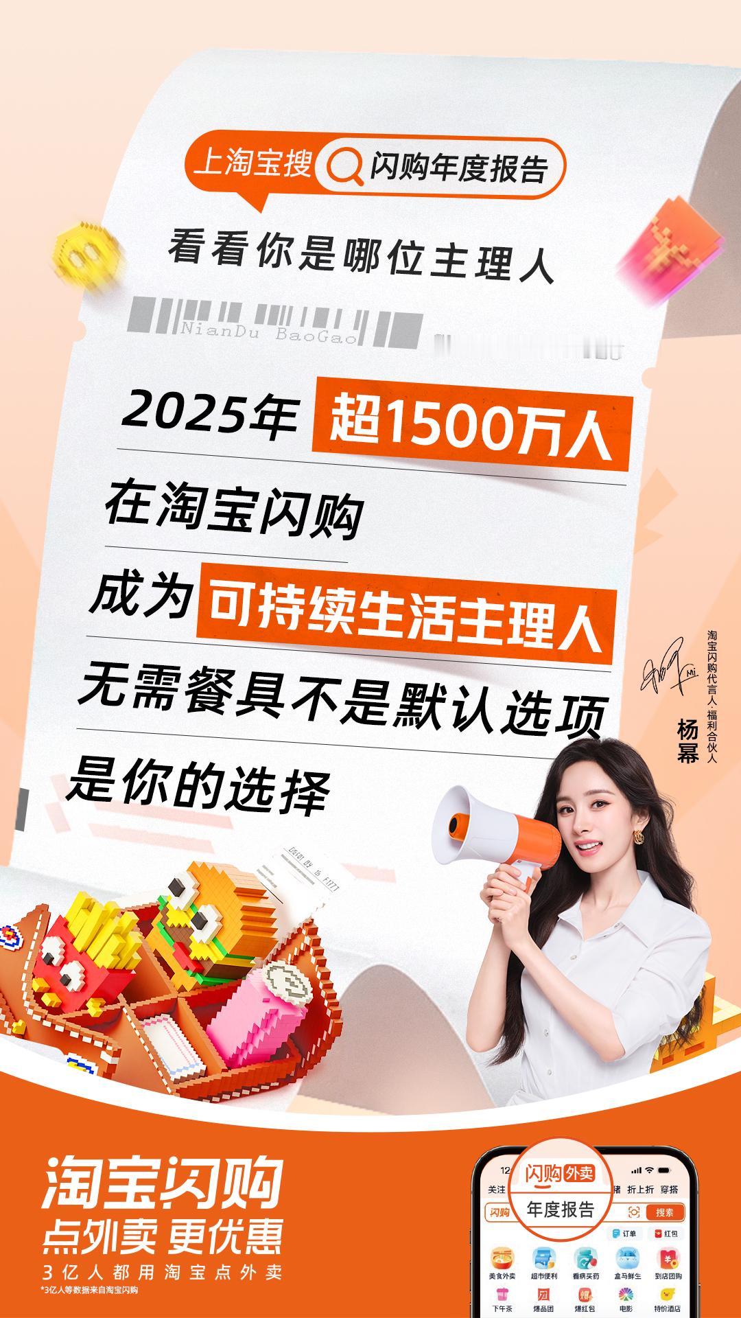 杨幂 🌟叮!跟着淘宝闪购代言人· 福利合伙人解锁即时美味,三餐四季的烟火气都被闪购外卖承包~上🍑搜【⚡️go年度报告】,测一测你的主理人身份~让我康康,是谁选择了杨幂为你揭晓呀?上🍑搜提取码【9162J6】抢奶茶免单卡,解锁年末外卖惊喜!每一份准时送达的美味,都藏着生活的小确幸✨淘宝闪购年度报告上淘宝闪购解锁你的年度主理人身份杨幂喊你查收淘宝闪购年度报告
