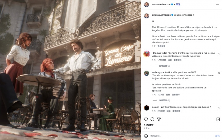 值得一提的是,今年5月马克龙也曾向SandfallInteractive表示祝贺,并称《33号远征队》是“法国大胆创新精神的闪耀典范”。