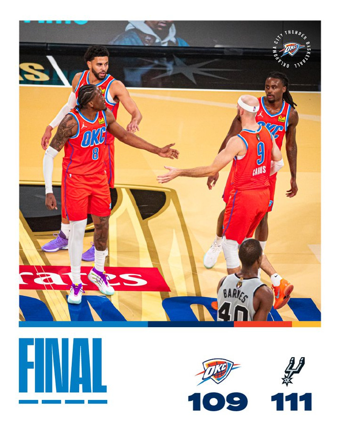马到功成!#马刺终结雷霆16连胜# 时隔12场比赛, 文班亚马复出, 在场20分39秒帮助马刺赢了21分, 带队完成16分逆转, 也终结雷霆16连胜, 天赋怪再加少林武僧, 真的可以无限猖狂! 波波维奇的接班人, 还是有点东西的, 首节就将文班压在了替补席, 玩了一手田忌赛马, 让有出场时间限制的文班, 在最关键的时刻发挥了重要的作用, 末节独得15分, 成为了主导比赛的关键人物! 只要能保持健康, 本赛季的马刺值得期待! 雷霆主要还是输在了三分球, 他们一度取得了16分的领先优势, 那是因为马刺投丢了太多的三分球, 而当他们第二节三分7中0, 比分迅速被追上。 雷霆本赛季三分命中率37.6%, 联盟能排第六, 但真正的高产的稳定射手并不多, 这也许会成为一丝隐患, 但无论如何, 这也仅仅是雷霆本赛季的第二场失利!