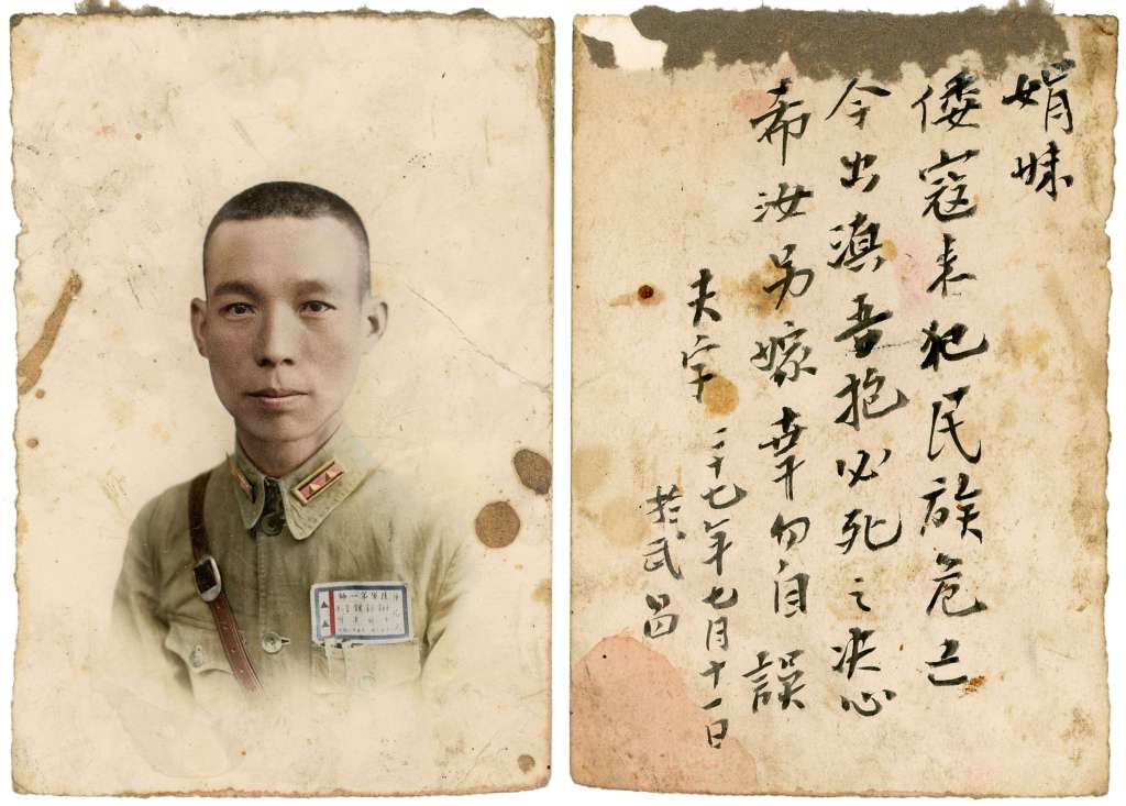 还有一张照片是1938年7月,云南军官陈绍武在武汉会战时期留给夫人的遗书。照片中这位年轻英俊、目光坚毅的云南军官名叫陈绍武。胸前的布质胸标表明他是陆军第一师步兵第一旅第二团第一营三连中尉连付(副),一位基层军官。这张照片来自他遗留的私人相册。背后的字迹刚劲有力:“娟妹:倭寇来犯,民族危亡。今出滇,吾抱必死之决心,希汝另嫁,幸勿自误。夫字,二十七年(1938年)七月十一日于武昌”。这张照片上的日期,表明它拍摄于武汉会战期间。这场发生于1938年6-10月的会战,是抗日战争战略防御阶段规模最大、时间最长、歼敌最多的一次战役。此战之后,日军转攻为守,抗日战争进入了相持阶段。