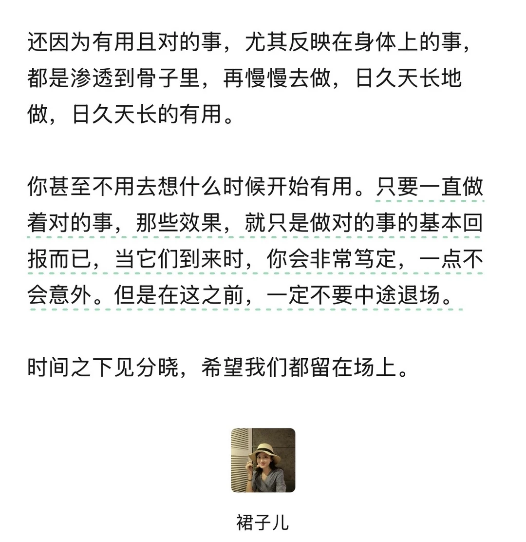 你甚至不用去想什么时候开始有用。只要一直做着对的事,那些效果,就只是做对的事的基本回报而已,当它们到来时,你会非常笃定,一点不会意外。但是在这之前,一定不要中途退场。