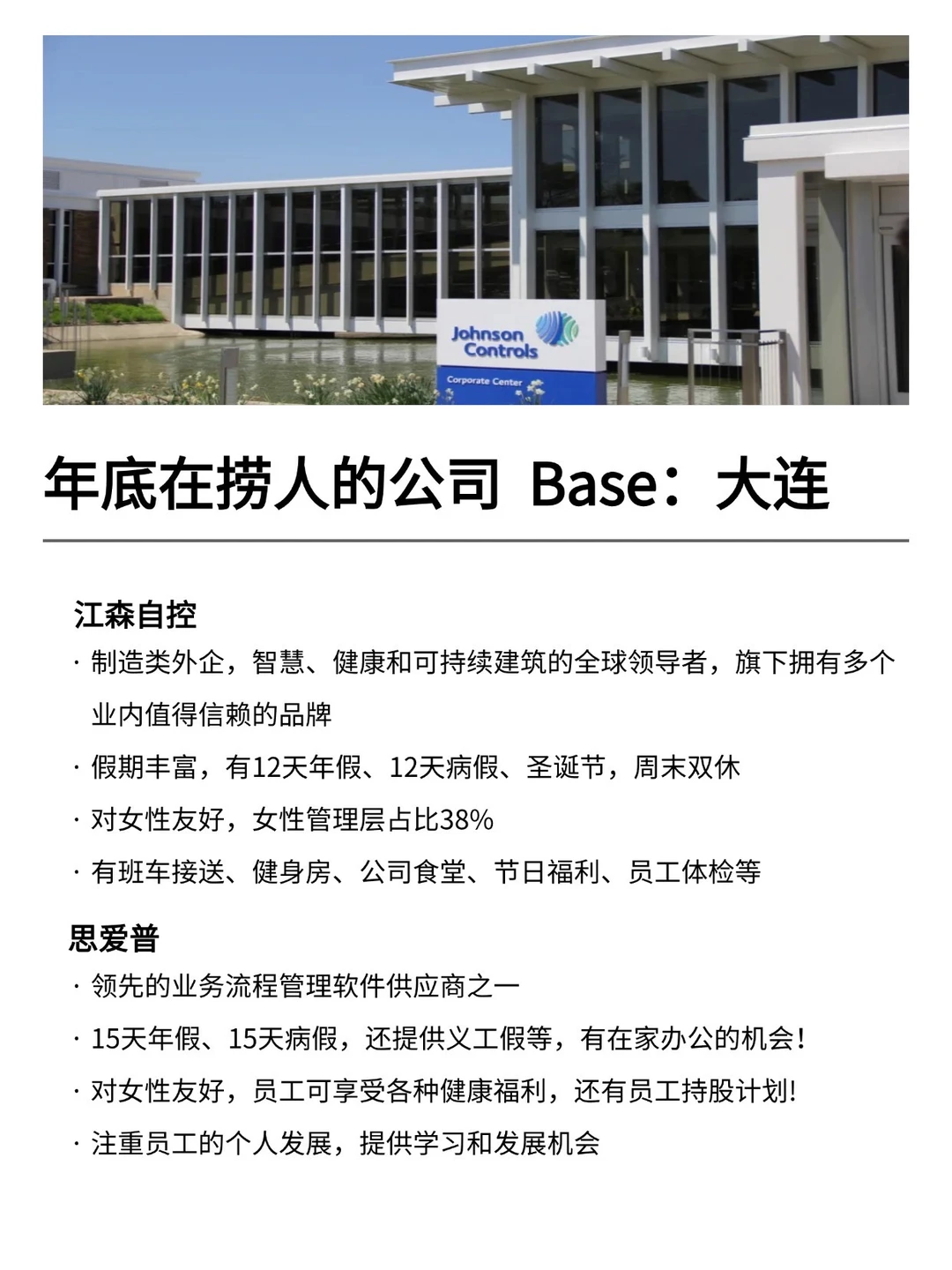 大连发展真的越来越好,有不少小而美、冷门宝藏的公司,机会是真的很多的! 特别是有不少小众冷门的外企,真心建议大家可以去试试 · 为什么还是值得去外企? ▪️氛围好,对女性友好,年假长,基本上都是10天起步 ▪️很多还都支持居家办公、福利完善,是真的能实现WLB ▪️待遇也还不错,想在年底找工作的真的可以考虑考虑~ · 坚持日更✊🏻,帮大家在找工作路上顺利拿 offer! ·