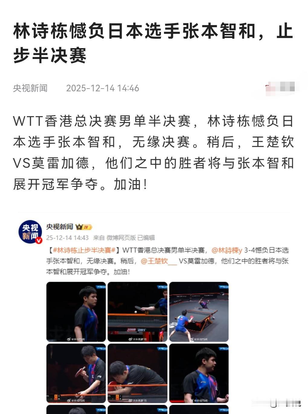 这也太遗憾了吧。 12月14日消息,林诗栋不敌张本智和止步半决赛。 最终3:4不