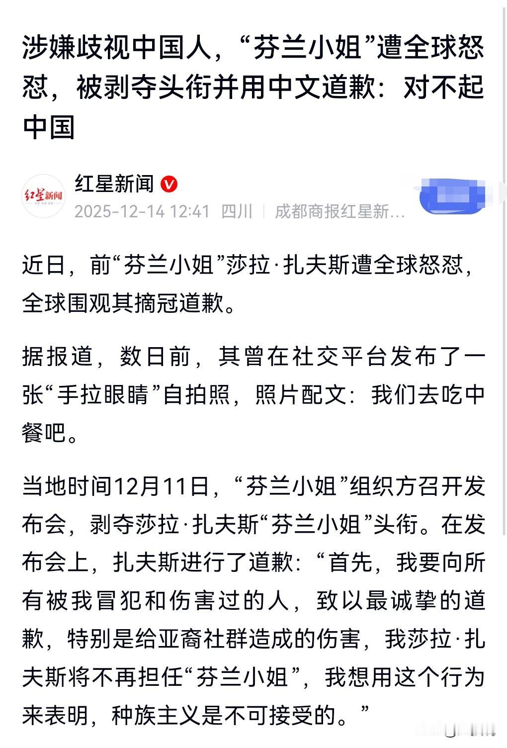 真的是岂有此理呀。 有一个芬兰选美小姐竟然敢歧视我们中国人。 实在是太无知无畏。 此事引发轩然大波。 结果她被剥夺芬兰小姐头衔。 这真是大快人心啊。 也敲响了警钟。 种族主义不可取。