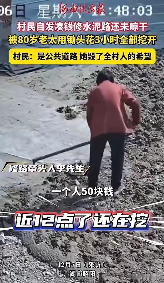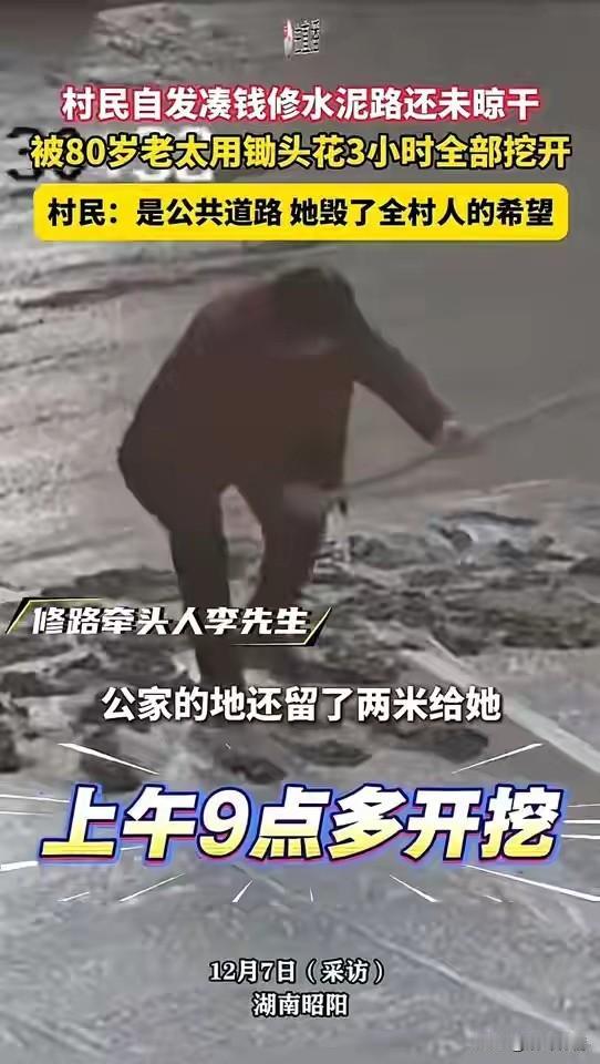 某村村民集资修路? 却被老太太阻挠, 本来村里的路是泥路, 一下雨就会泥泞不堪, 李先生实在看不上, 就联合了很多村民集资修路, 村民们也是纷纷应答, 很快就将路修好了, 是水泥未干就被一个老太太, 拿着锄头全部给破坏, 原因竟然是因为太太开的荒地被占用了,大家都知道这是公家的地, 奈何被老太太霸占了, 修路的时候还特地给她留了很多, 没想到她居然会这么干, 用个人的私利影响集体的利益, 本来还有人去阻止, 奈何老太太拿着锄头, 表示谁上去阻止就打谁, 老太太在村里面也是难缠的主, 这可让村民心血白费了, 以后还要走土路, 有网友表示年龄大不是挡箭牌, 报警处理就好了! 也有网友表示这样的老太太惹不起, 叔叔也很头疼遇到这样的事! 大家对于这样的老太太怎么看? 修路 乡村修路 修补水泥路 群众集资修路 乡村修路纠纷