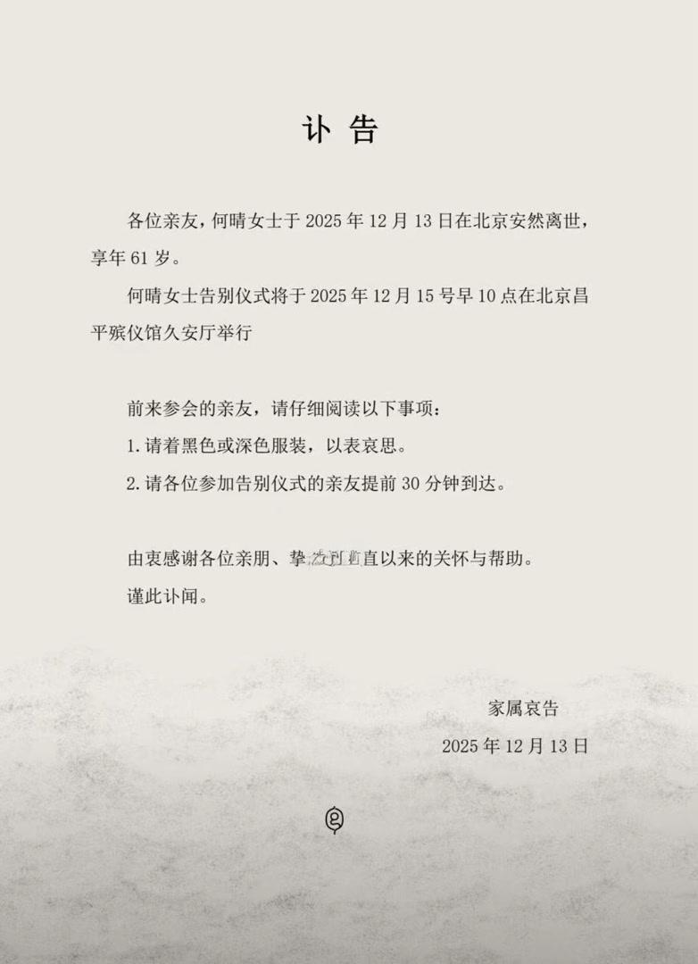 天有不测风云,人有飞来横祸,活着的人且珍惜,过好每一天。12月13日,著名演员何晴家属发布讣告显示,何晴因病在北京安然离世,享年61岁。