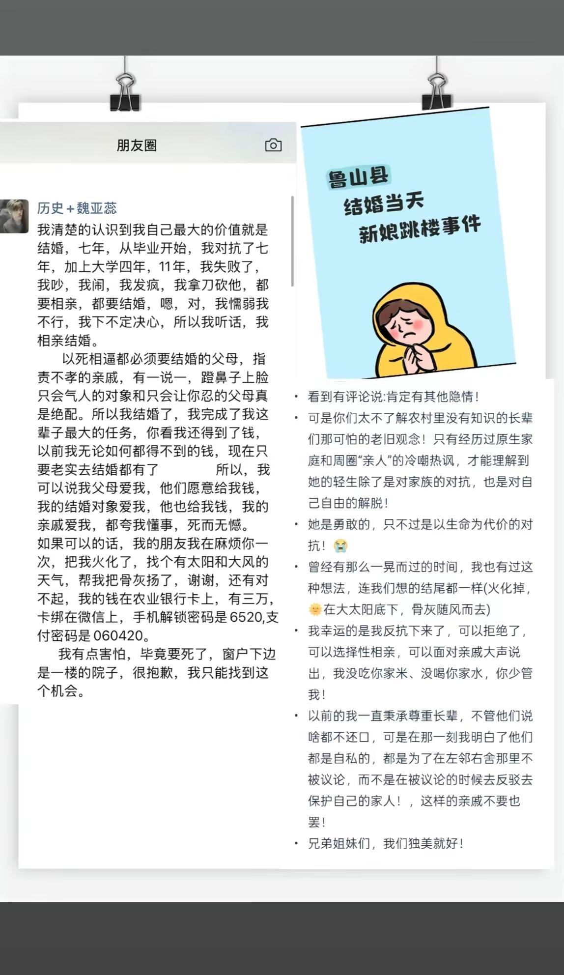 鲁山28岁女教师,因催婚,结婚当天跳楼!鲁山28岁女教师,因被父母催婚,结婚当天跳楼!17岁上大学就开始被催婚,上班后工资被父母截留,结婚的时候父母又索要27万彩礼,为儿子结婚准备使用!什么样的父母能做到如此狠心!这不是嫁女儿,而是以女儿的婚姻作为筹码,这是父母的悲哀,也是社会的悲哀!一切都是钱造成的!