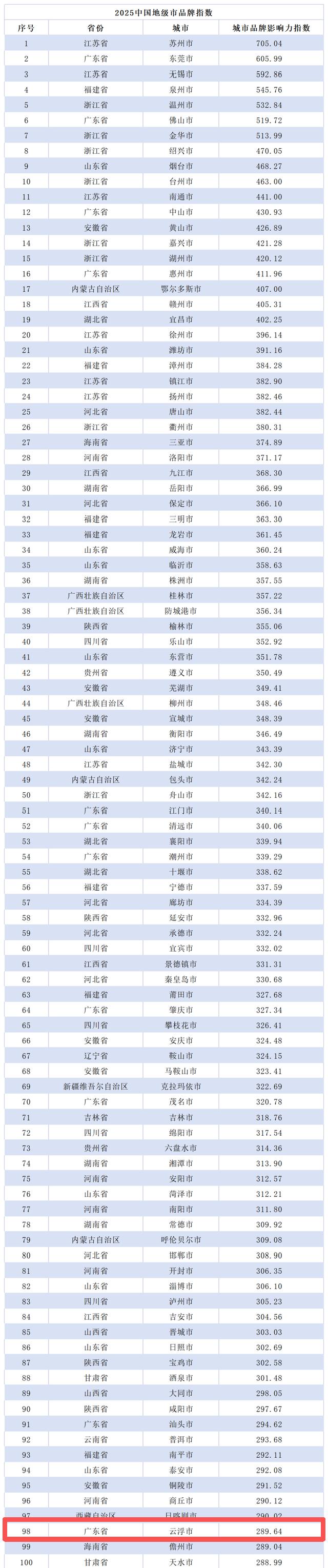 近日发布的全国地级市城市品牌指数榜单显示,广东云浮市首次进入前100名城市名单榜单,在全国293个地级市中,位列第98位!成为今年广东11个上榜地级市之一。