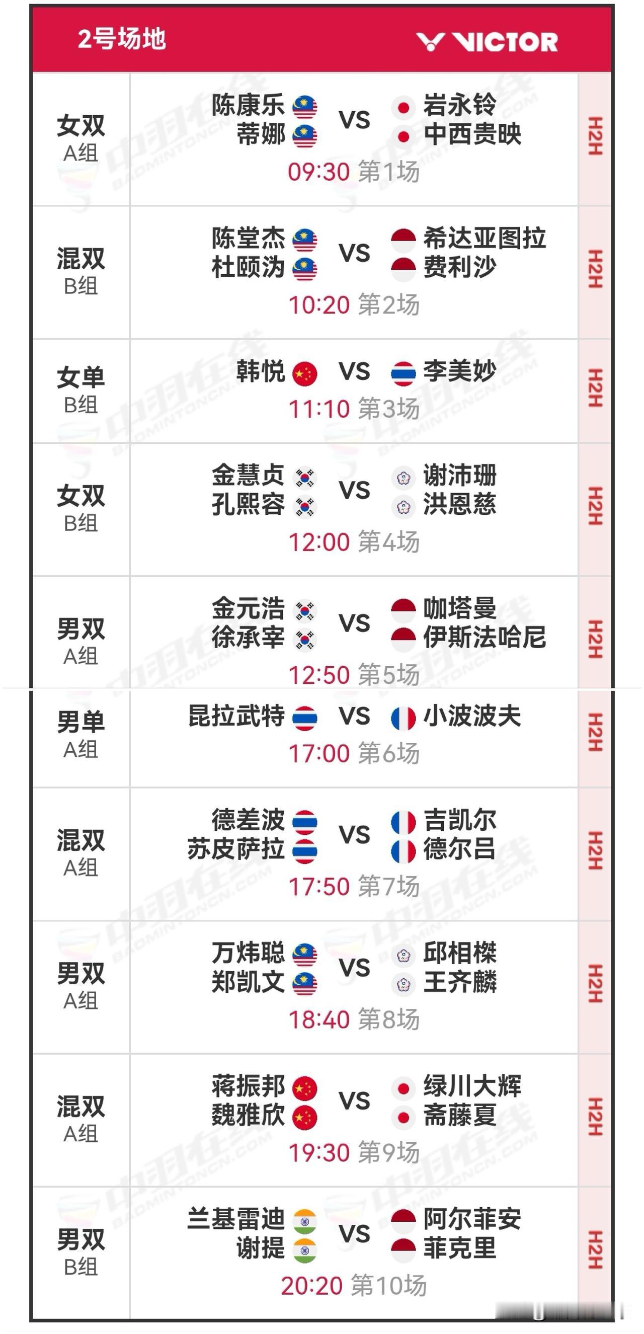 12月18日世界羽联年终总决赛小组循环赛对阵安排 12月18日将开展小组循环赛第二轮。白天场依旧于北京时间09:30启幕,晚场则在北京时间17:00开场,届时会有两块场地同时进行比赛。对阵情况包括石宇奇对战周天成,李诗沣迎战奈良冈功大,梁王组合对阵谢定峰/苏伟译,凡贤组合对阵日本队,圣谭组合对战韩国队。详细对阵安排如下: 羽毛球 羽毛球爱好者 羽球赛程 羽毛球比赛 国羽 石宇奇 李诗沣 凤凰组合 梁王组合 国羽加油