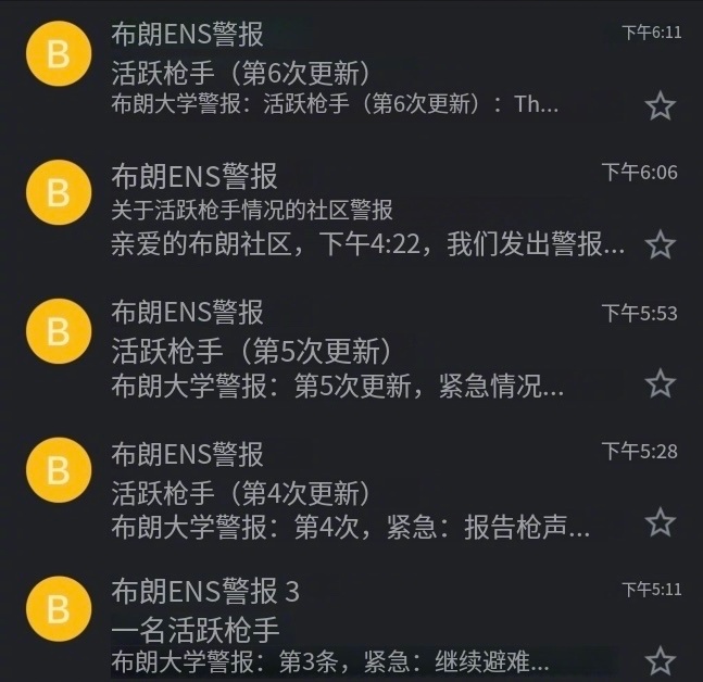布朗大学突发校园枪击事件,目前已有2人死亡,8人重伤(伤亡数字可能会更新),蒙面枪手仍然在逃。事发时,学校正处于期末考试第二天,校方随即发布警报,敦促学生和教职员工就地避险。布朗大学周六向学生发出警报,称校园内有枪手出没。“巴鲁斯和霍利工程学院(Barus & Holley Engineering)附近发生枪击事件。”学校在下午4点20分左右发布的紧急警报中称。“锁好门窗,手机调至静音模式,待在家中,直至另行通知。”通知称。事发后,大量警力赶赴校园区域,并展开搜寻工作。