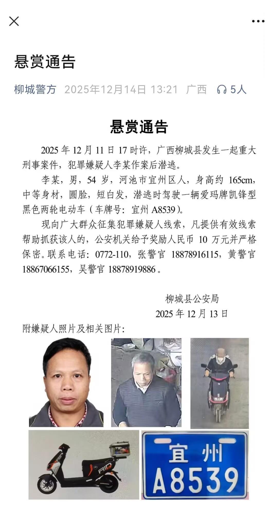 12月14日,广西柳州市柳城县公安局发布警情通报:2025年12月11日17时许,柳城县马山镇发生一起刑事案件。经查,犯罪嫌疑人李某(男,54岁)持刀对黄某某(女,45岁)、陈某某(女,57岁)行凶。两名被害人经医院抢救无效死亡,犯罪嫌疑人作案后潜逃。目前,我局已组织警力全力侦查抓捕,发布悬赏通告。请广大群众发现犯罪嫌疑人行踪信息后及时报警。