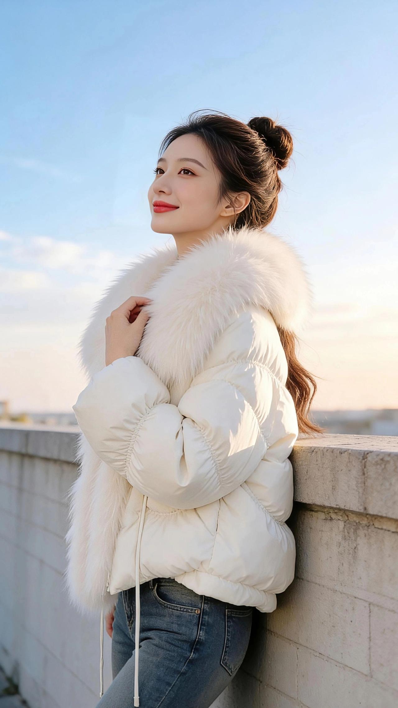 冬日晴岚里的绒白诗篇 晴日的风掠过矮墙,捎来清冽的温柔,像揉碎了一捧星光洒在肩头。少女立在石砌的矮墙上,周身裹着蓬松的米白羽绒,那圈丰盈的狐毛领似初雪凝在颈侧,绒绒的,暖融融的,将冬日的寒意向后推了三尺。 她棕发挽成松松的髻,几缕碎发垂在颊边,被风拂得轻轻晃。浅红的唇抿着笑,眼波亮得像盛了晴空的蓝,抬手时,羽绒袖管鼓起软软的弧度,指尖向澄澈的天际一点,仿佛要去触碰那抹晃眼的蓝。风绕着她的衣摆打转,毛领的流苏随动作轻扬,与牛仔裤的硬朗织成温柔的对比,又或是衬着百褶裙的软,漾出少女独有的清甜。 她有时斜倚着墙,指尖轻捻毛领的绒,侧脸的轮廓在日光里柔和得像瓷;有时插兜而立,笑意漫在眼角,羽绒的蓬松衬得身姿更显高挑,肤白胜雪,与衣色相融,却又在眉眼间绽出鲜活的艳。转身时,后背的羽绒纹路起伏如云朵,毛领的白在身后晕开一片软,她回头望来,笑意在唇角漾开,像冬日里突然撞见的暖阳,把矮墙、晴空、流云,都揉进了这帧温柔的画面里。 风还在吹,晴光依旧,少女的身影嵌在天地间,成了冬日里最软的诗,字字句句,都写着绒白的温柔与青春的明媚高级感穿搭 时髦穿搭 小个子穿搭 冬季穿搭