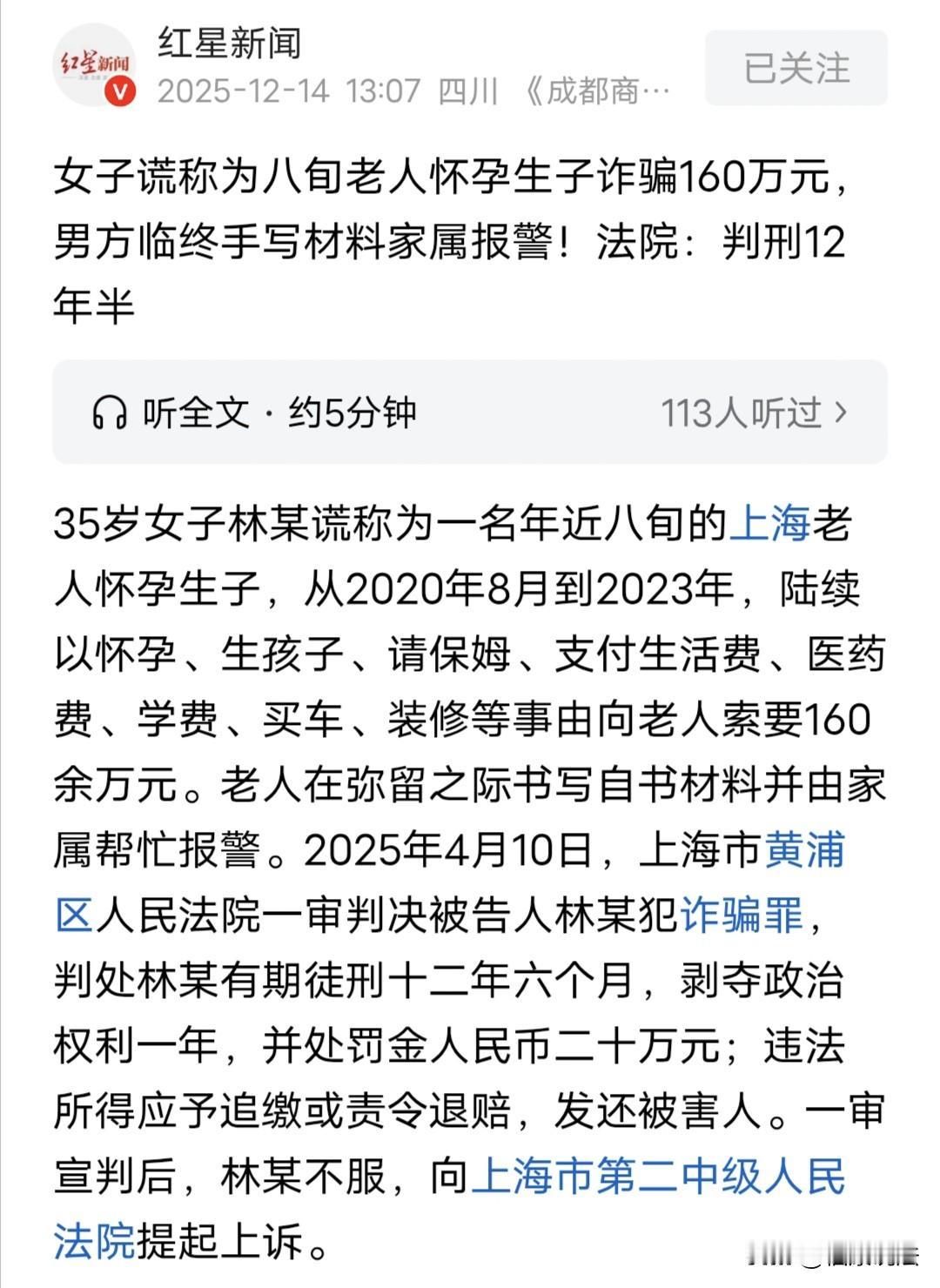 上海,32岁女子和一70岁老人有了男女关系,1年后,女子告诉老人她怀孕给他生了一个儿子,在3年期间向老人索要160万元,老人弥留之际写了一份女子给她生育一子的材料,家属拿着材料报了警,才知女子当初回到家结婚生子,用自己儿子冒充老人“儿子”生病,向老人不停的索要各种费用,法院一审以诈骗罪判处女子12年6个月,并处20万罚金,女子不服上诉,说她只骗老人4.5万,其他都是老人自愿赠与,二审法院会怎么判呢? 2019年,32岁的林某怀揣着对大城市的向往来到上海工作。 这期间她认识七旬老人石某,或许是孤独,也许有其他难以言说的原因,两人慢慢发展成了男女关系。 可谁曾想,这背后隐藏着林某贪婪的阴谋。 2020年,可能大城市求生对林某来说有点难,她决定离开上海,回福建福安老家。 回了老家后,她很快结婚生子了,生活也走进了下一阶段。 然而,她有了家庭也没有安分守己,反而想起了远在上海的石某,觉得在他身上有利可图。 从2020年8月开始,林某给石某编织了一个精美的陷阱,她告诉石某自己怀孕为他生下一个儿子,小名叫“牛牛”,大名叫“石一凯”。 石某年纪大了,一听老来得子,心里是又惊又喜又感动。 林某趁机开始她的计划,他以怀孕、生孩子,问石某要钱。 之后,她说自己一个人照顾孩子照顾不过来要请保姆,又说孩子各种花销大让石某给钱。 得逞后,林某胆子越发的大了,以买车、装修,编造五花八门的理由,一次次的跟石某要钱。 石某一想到自己“儿子”需要他,就一次次的满足林某的要求。 就这样,在短短三年多的时间里,林某从石某那里骗走了160万余元。 石某年事已高,年近八旬,身体情况每况愈下,在生命的弥留之际,他也许感觉到了不对劲,于是,他手写了一份林某为自己生了一个儿子的材料。 随后,家属拿着这份材料报了警。 2024年5月8日,林某在老家被抓获,她对石某所做的一切真相浮出了水面,等待她的是法律的审判。 法院一审会怎么判呢? 《刑法》第266条规定:诈骗公私财物,数额特别巨大或者有其他特别严重情节的,处十年以上有期徒刑或者无期徒刑,并处罚金或者没收财产。 首先,林某虚构自己为老人石某怀孕生子的事实,并以自己孩子生病冒充石某的“儿子”伪造医院预约记录单、以“孩子父亲”名义索要钱款,属于典型的“虚构事实”。 其次,林某通过欺骗手段获取钱财后,用于个人消费(如买车、装修),而不是用于所谓石某“儿子”的抚养,证明其主观上具有非法占有目的。 最后,林某骗取160余万元,远超“数额特别巨大”标准(50万元以上),依法应处十年以上有期徒刑或无期徒刑。 法院一审认为,林某的行为完全符合诈骗罪的构成要件。 因此,法院一审,以诈骗罪判处林某12年6个月有期徒刑。 然而,林某并不服气,她提出上诉,在上诉过程中,她极力狡辩,说自己拿自己孩子冒充石某的“儿子”生病骗了他4.5万元,剩下的钱都是石某自愿赠与她的,她根本没有虚构为石某怀孕一事。 林某的辩护人提出一系列看似“合理”的理由: 第一,林某和石某是情人关系,有一部分钱款是石某赠与林某的。 第二,2021年2月之前,石某给林某30万元,是因为林某怀孕他自愿给的,和诈骗无关。 第三,后续给的钱可能是包养费或者生活费,也属于赠与。 第四,林某到底有没有为石某流产的事没查清,石某个人报案的意愿还有报案材料存疑,而且,石某写的材料里也没说报警。 最终林某只承认部分诈骗,请求二审法院对她从轻处罚。 那么,林某的的辩解能得到二审的支持吗? 二审法院认为,本案中,林某辩解的内容前后矛盾,与事实不符。 1、林某之前辩解说自己真的怀了石某的孩子,后来在一个私人诊所把孩子流掉了,可警方调查发现根本不是这么回事,她在撒谎。 2、林某上诉时说,从来没告诉石某孩子是他的,还说石某一直都知道孩子不是他的。结果到了庭审,她又改口说自己确实怀了石某的孩子,石某曾陪她去医院检查,最后孩子引产,前后说法不一致。 3、林某说石某给她钱是因为两人是情人关系,还经常luǒ聊,可她被抓后每次交代的情况都对不上。 4、从常理来讲,石某近80岁,身患重病,林某早就回了老家,两人不可能因为所谓情人关系luǒ聊关系,就一次又一次给林某160多万。 二审法院认为,石某年近80岁了,要不是因林某的欺骗行为误以为“他确实有个儿子”也不会支付钱款,石某的赠与行为是基于错误认识,并非他的真实意愿。 《民法典》第657条规定:赠与合同是赠与人将自己的财产无偿给予受赠人,受赠人表示接受赠与的合同。 最终,二审法院判决:林某的行为构成诈骗罪,驳回其上诉期维持原判。本次裁定为终审。 原判:林某犯诈骗罪,判处有期徒刑12年6个月,剥夺政治权利1年,并处罚金20万,违法所得责令退赔,还给石某。 对此你怎么看呢