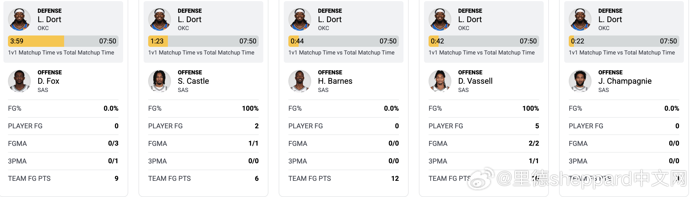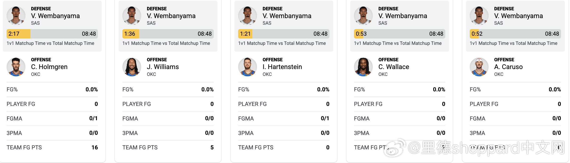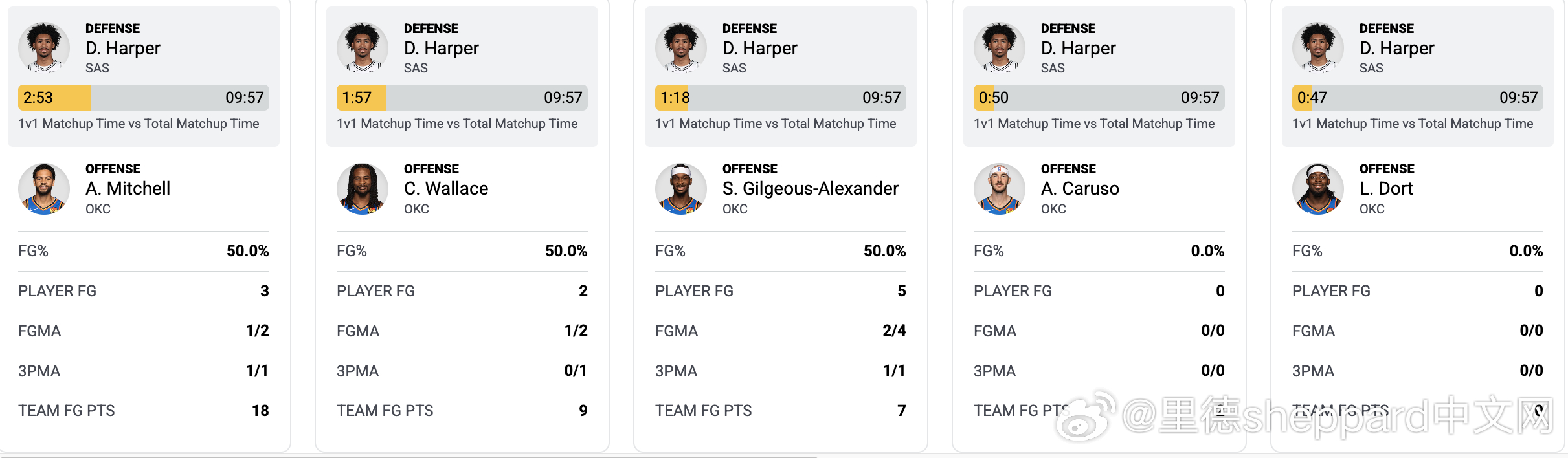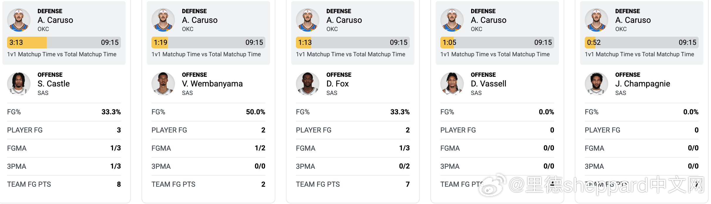 【简单看下马刺战胜雷霆的背后数据】基础数据简单概括下,篮板马刺52:51雷霆,助攻21:20,利用失误得分26:25,失误19:14,二次进攻得分16:6,内线得分40:44,犯规23:25那么马刺赢球的背后依靠什么呢?1. 进攻篮板带来的二次进攻机会,马刺有文班这个点,有科内特的篮板和全队的冲抢2.比雷霆命中更多的三分球(多了4个,这就是12分),有时候命中率是一方面,命中数也是另一方面,本场马刺出手42次三分,雷霆出手37次…(作为对比看下火箭面对西部这几个强队的三分统计:火箭输雷霆的比赛,2个加时,全场出手39个三分,雷霆出手52次火箭输马刺的比赛,全场出手27个三分,马刺出手45次火箭输掘金的比赛,全场出手36个三分,掘金出手29次)首先我们来看图1,雷霆本场出机会的投篮,预期命中率是47.9%,而实际命中率是41.3%,马刺的预期命中率是41.4%,实际命中率是41.1%雷霆的出手合理性远高于马刺,但马刺本场防守端给的压力真的很好,尤其是文班亚马我们再看下马刺和雷霆几个球员的对位防守效果:图2 卡斯尔的防守确实不错,防SGA,切特,杰伦威这样已经不错了图3, 图4 【文班的防守作用就在于不让对位防守人出手,极大的限制出手数,几乎没有雷霆球员能在他的对位中得分。文班在场,雷霆只能通过传导球轮转换位,让得分手远离文班的对位回合…】图5,哈珀的实际防守效果一般吧,中规中矩图6,SGA的外线防守也能限制对手出手,这点是SGA很强的一点。图7,fox,卡斯尔,哇塞尔面对卡森得分效果都很好。卡森限制哈珀效果好,也是雷霆中间拉开分差的一部分原因…图8,多特防守福克斯效果很好,福克斯3中0,但是转换时,卡斯尔的快下和哇塞尔的三分球,让多特也防不住图9,卡鲁索对于雷霆太重要太重要了,经验和对抗,让卡鲁索面对马刺任何人,包括对文班的防守都能占到上风,卡鲁索让我想起勇士王朝替补那个一哥的作用,稳定军心,攻防都有贡献NBANBA休斯顿火箭马刺马刺休斯顿火箭