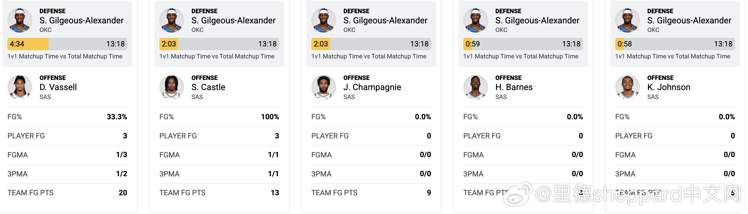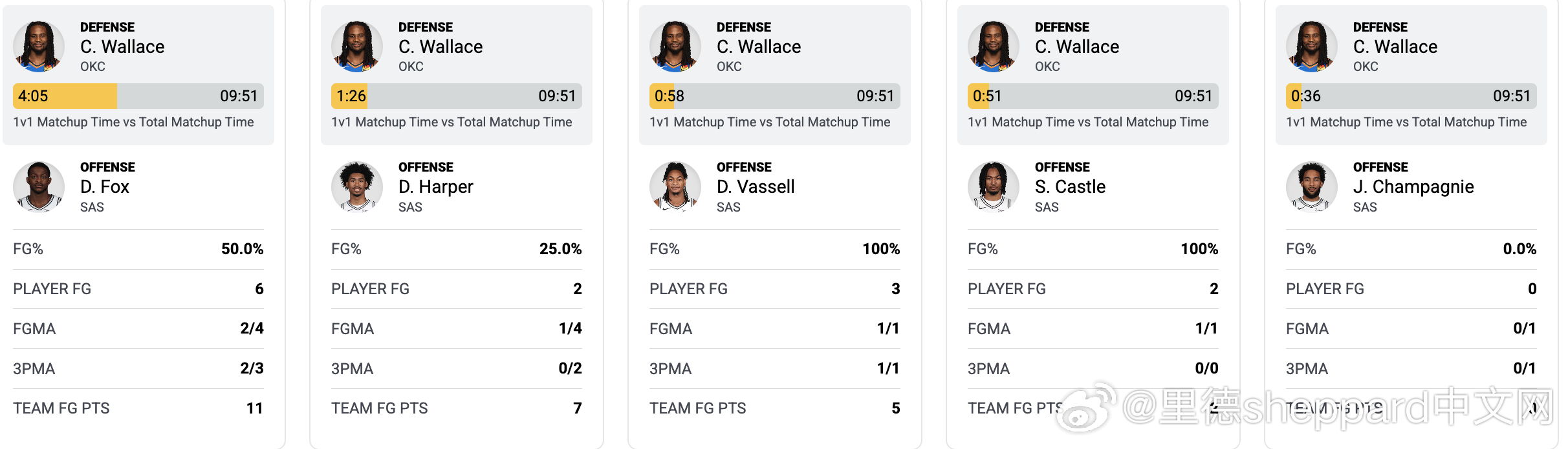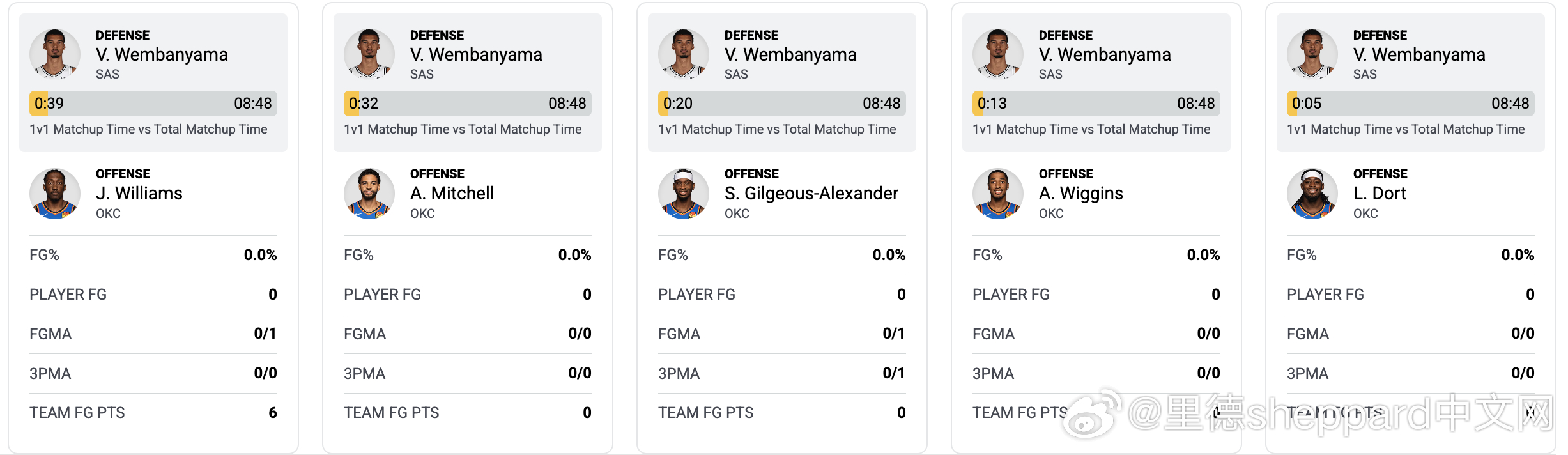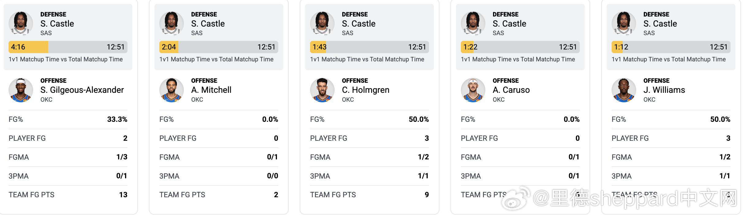 【简单看下马刺战胜雷霆的背后数据】基础数据简单概括下,篮板马刺52:51雷霆,助攻21:20,利用失误得分26:25,失误19:14,二次进攻得分16:6,内线得分40:44,犯规23:25那么马刺赢球的背后依靠什么呢?1. 进攻篮板带来的二次进攻机会,马刺有文班这个点,有科内特的篮板和全队的冲抢2.比雷霆命中更多的三分球(多了4个,这就是12分),有时候命中率是一方面,命中数也是另一方面,本场马刺出手42次三分,雷霆出手37次…(作为对比看下火箭面对西部这几个强队的三分统计:火箭输雷霆的比赛,2个加时,全场出手39个三分,雷霆出手52次火箭输马刺的比赛,全场出手27个三分,马刺出手45次火箭输掘金的比赛,全场出手36个三分,掘金出手29次)首先我们来看图1,雷霆本场出机会的投篮,预期命中率是47.9%,而实际命中率是41.3%,马刺的预期命中率是41.4%,实际命中率是41.1%雷霆的出手合理性远高于马刺,但马刺本场防守端给的压力真的很好,尤其是文班亚马我们再看下马刺和雷霆几个球员的对位防守效果:图2 卡斯尔的防守确实不错,防SGA,切特,杰伦威这样已经不错了图3, 图4 【文班的防守作用就在于不让对位防守人出手,极大的限制出手数,几乎没有雷霆球员能在他的对位中得分。文班在场,雷霆只能通过传导球轮转换位,让得分手远离文班的对位回合…】图5,哈珀的实际防守效果一般吧,中规中矩图6,SGA的外线防守也能限制对手出手,这点是SGA很强的一点。图7,fox,卡斯尔,哇塞尔面对卡森得分效果都很好。卡森限制哈珀效果好,也是雷霆中间拉开分差的一部分原因…图8,多特防守福克斯效果很好,福克斯3中0,但是转换时,卡斯尔的快下和哇塞尔的三分球,让多特也防不住图9,卡鲁索对于雷霆太重要太重要了,经验和对抗,让卡鲁索面对马刺任何人,包括对文班的防守都能占到上风,卡鲁索让我想起勇士王朝替补那个一哥的作用,稳定军心,攻防都有贡献NBANBA休斯顿火箭马刺马刺休斯顿火箭