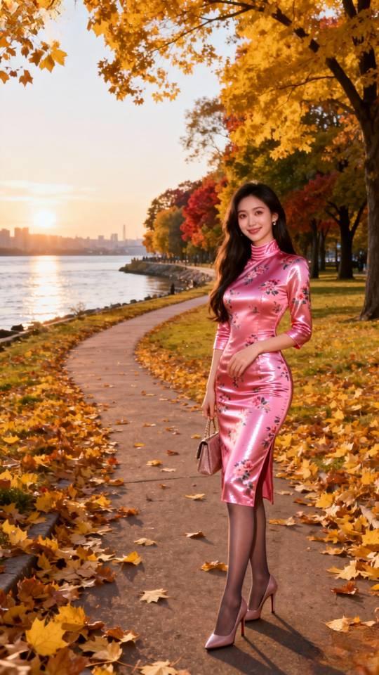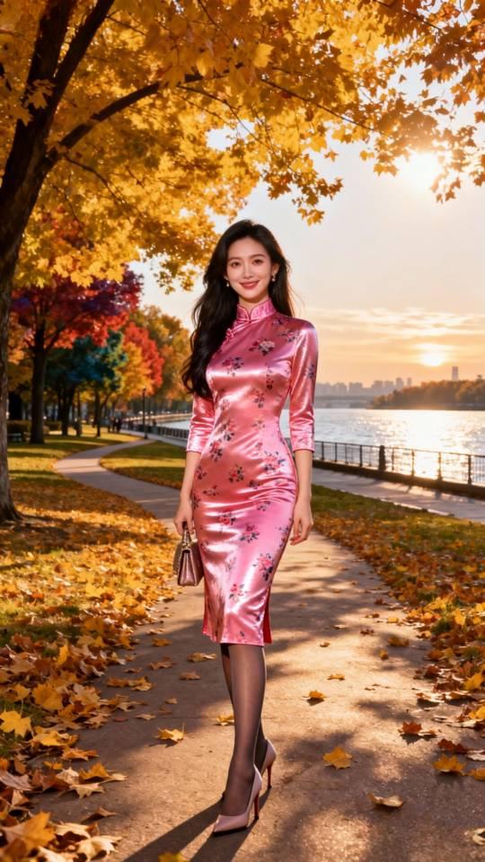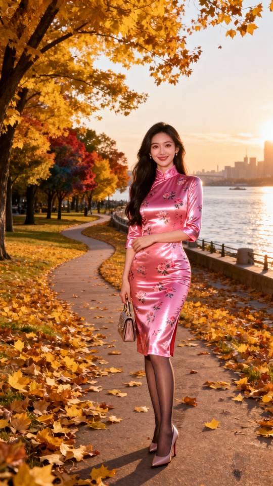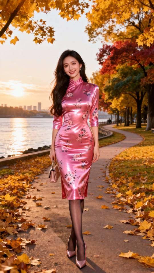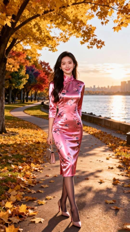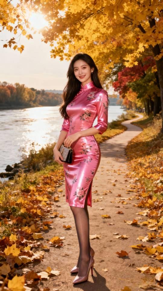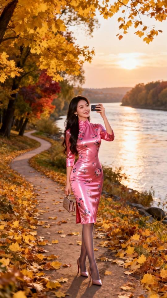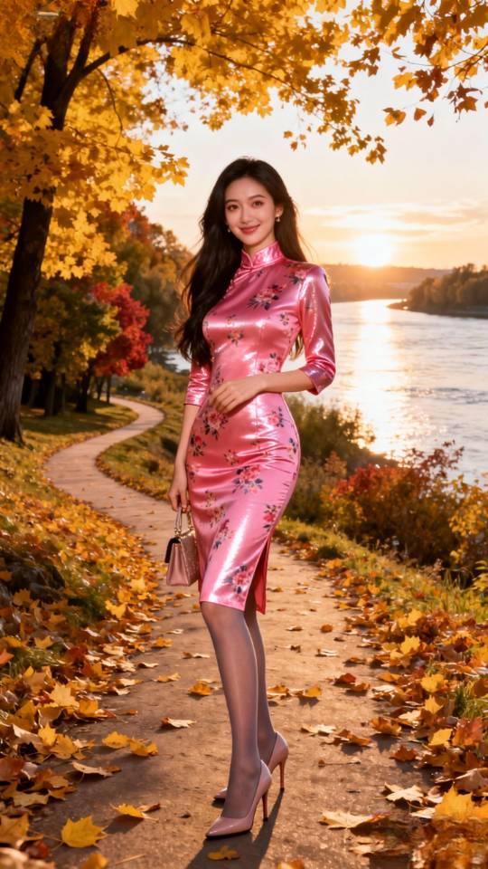 紫玉旗韵映山湖秋风轻拂,湖畔佳人,身着一袭淡紫旗袍,优雅如兰。旗袍上,花卉纹