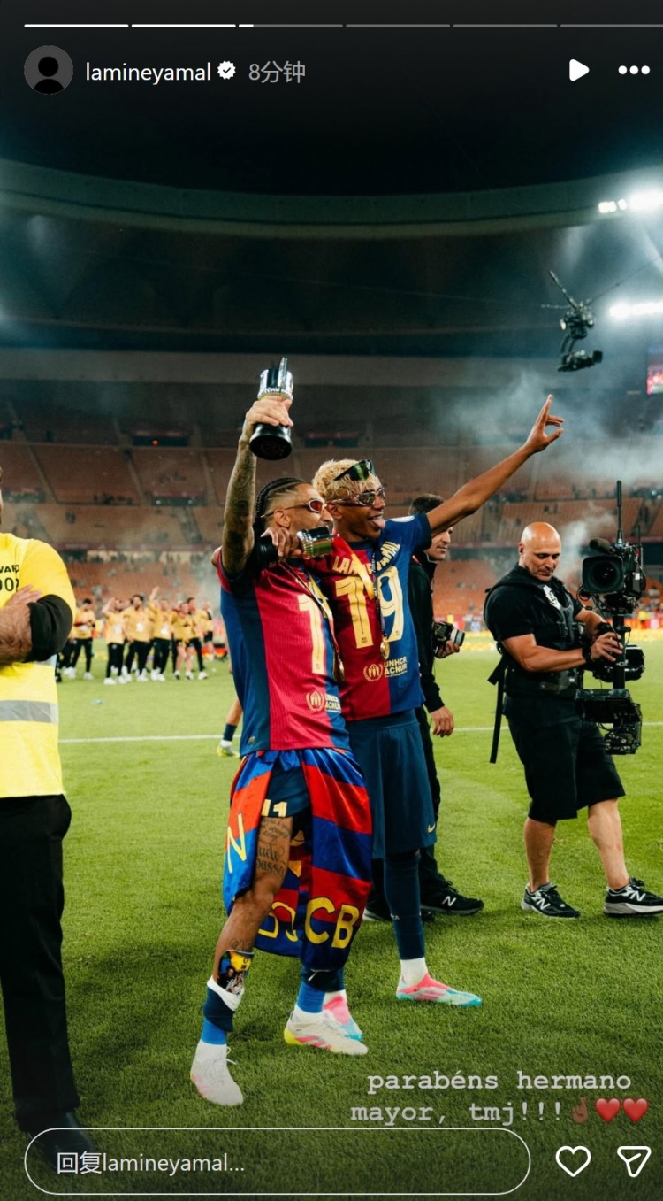 今天是拉菲尼亚的29岁生日,亚马尔社媒晒出与拉菲尼亚的合照,配文:“生日快乐,大哥,永远支持你!”