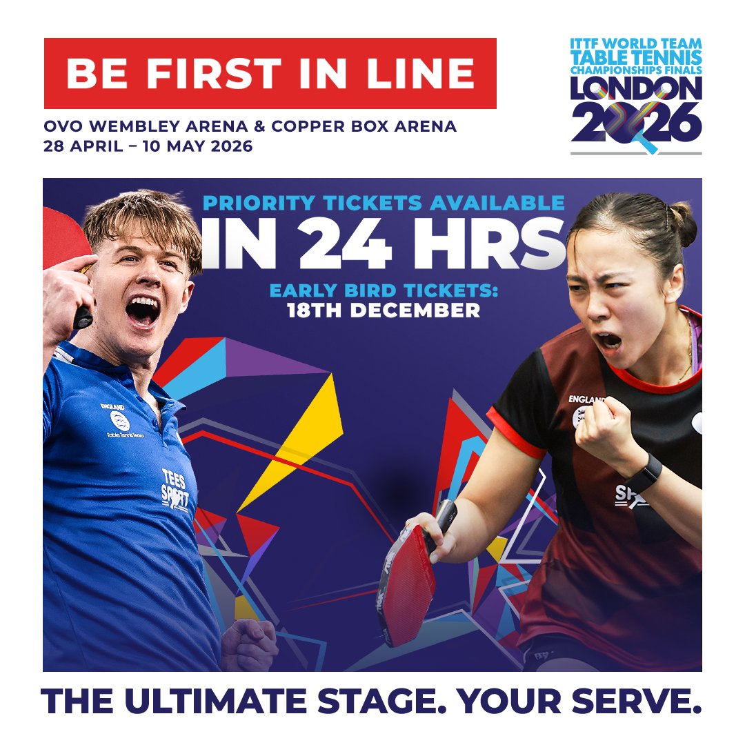 TableTennisEngland报道。距离会员优先购票窗口开启还剩不到24小时#ITTFWorlds2026#伦敦2026#YourServe