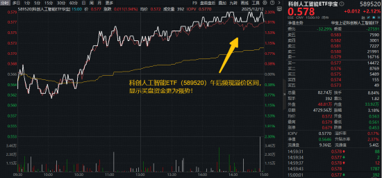 周五(12月12日)重点布局国产AI产业链的科创人工智能ETF(589520)早盘翻红后,发力走高,场内涨幅最高上探2.3%,收涨2.12%,全天成交额4729万元,环比激增92%,值得关注的是,该ETF午后频现溢价区间,显示买盘资金更为强势,伴随成交大幅放量,或有资金进场布局!