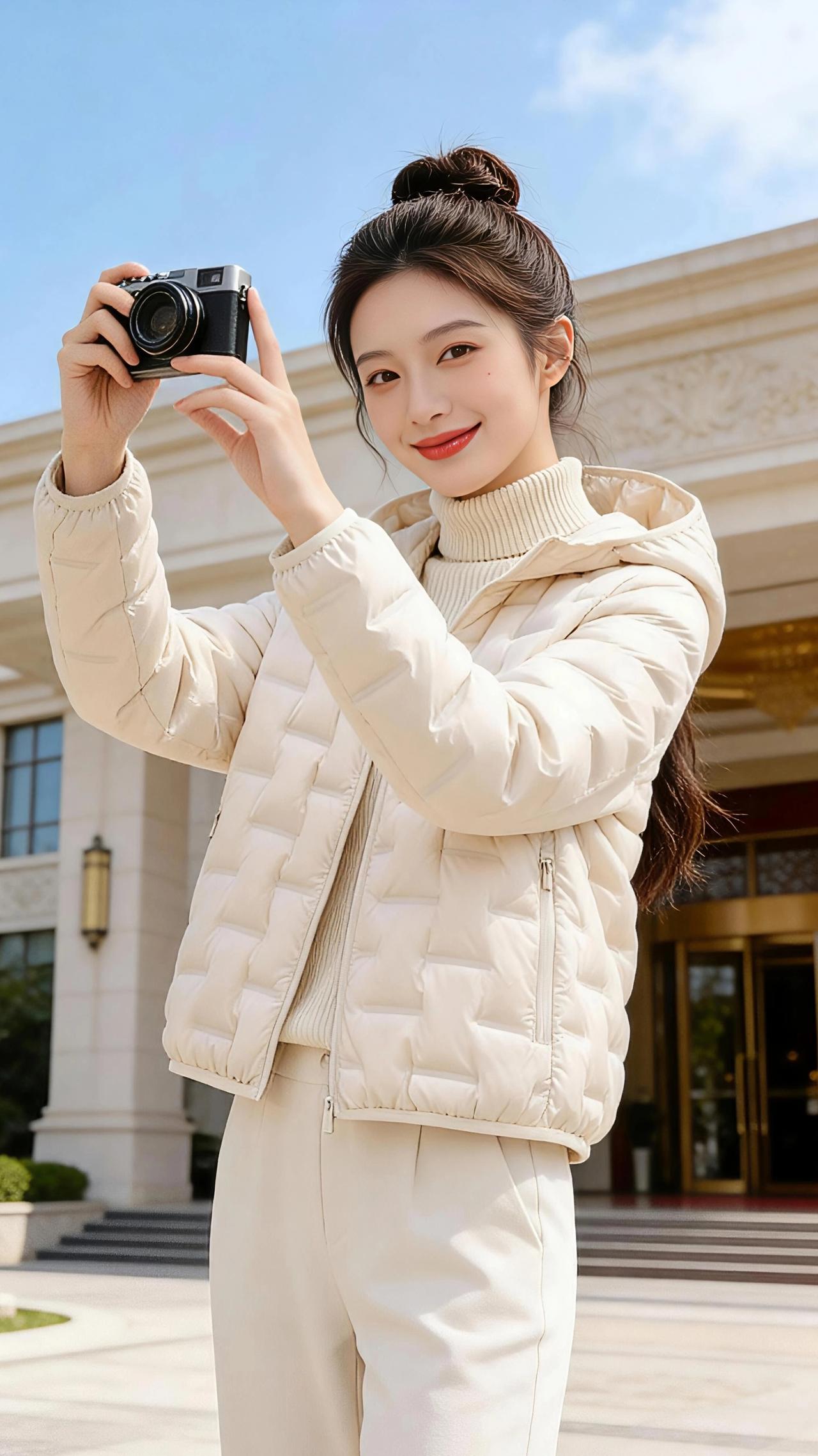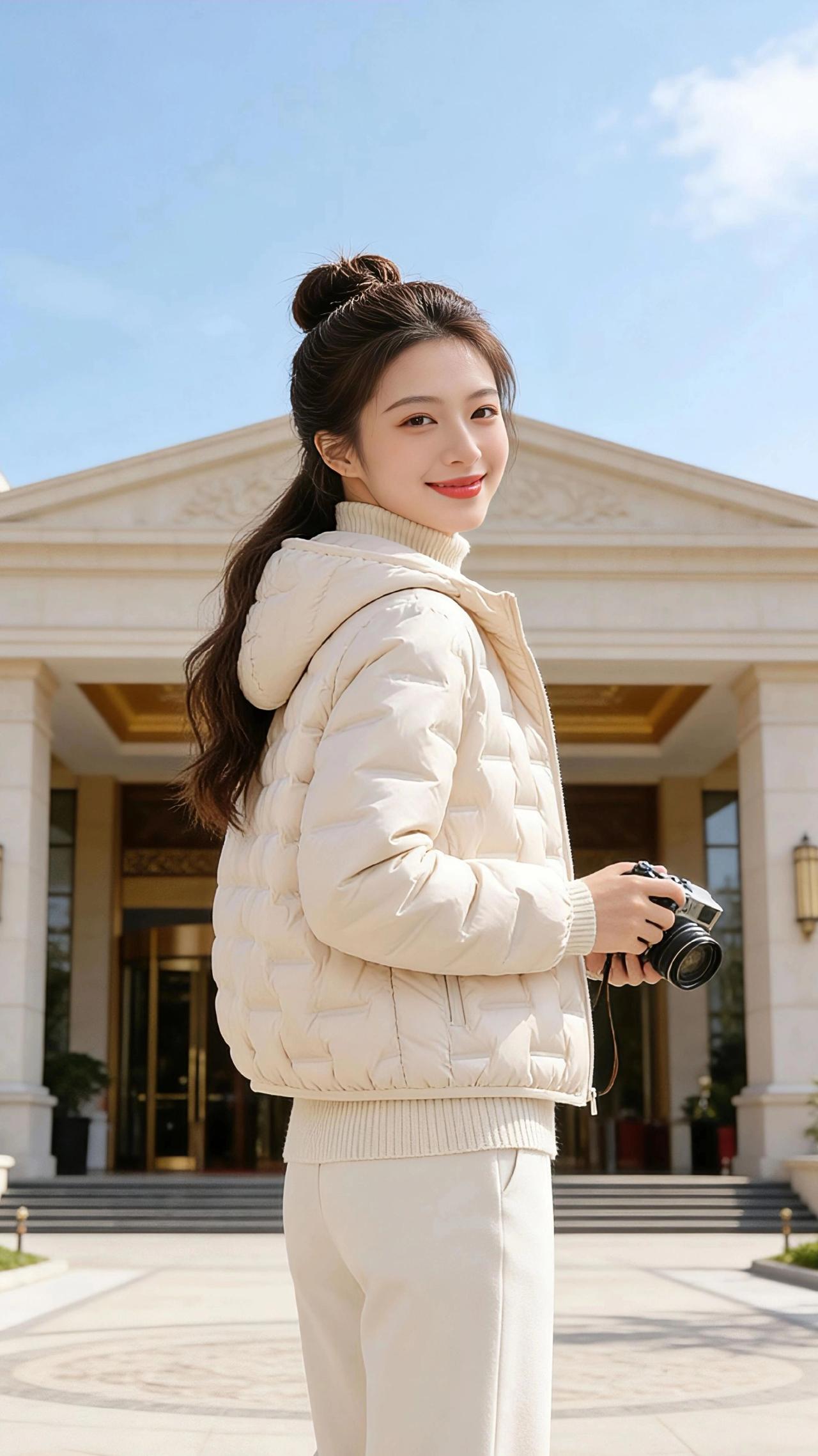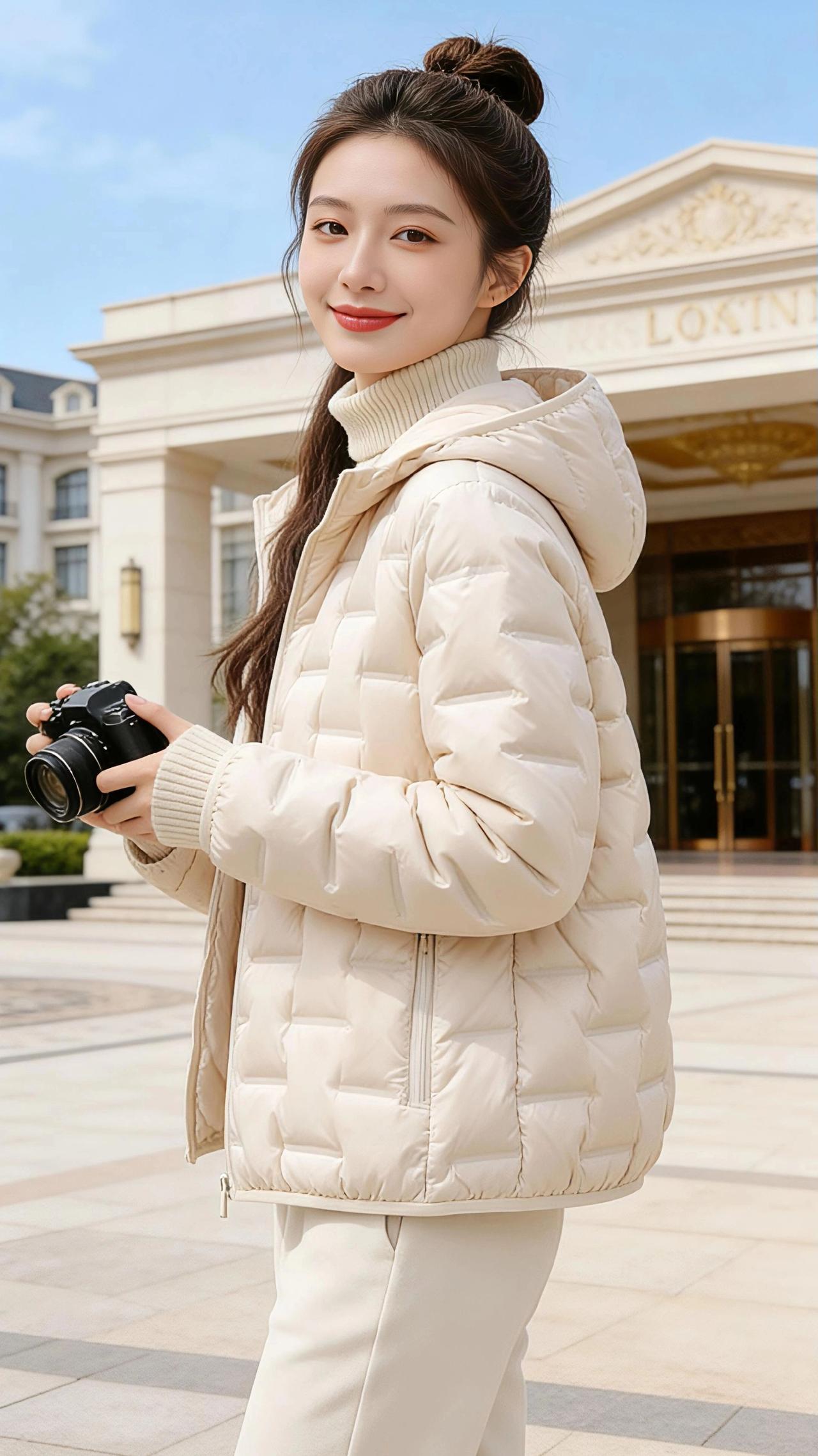 暖阳里的轻暖 初冬的风裹着微凉,却被一件米白轻薄羽绒服妥帖挡在身外。蓬松的菱格纹路像揉皱的云朵,松松软软地贴着肩背,连带着高领针织的温柔,把寒意都滤成了温柔的絮语。 手里的相机还凝着指尖的温度,举起来时,镜头框住了澄澈的蓝天,也框住了欧式建筑的雕花廊柱。阳光斜斜地落下来,在羽绒服的面料上淌出浅浅的光,像给这件小袄镀了层牛乳色的糖霜。 转身时,发梢的丸子头轻轻晃悠,羽绒服的帽檐蹭过耳尖,软乎乎的。把相机揣在臂弯,或是插兜漫步,风从领口钻进来,又被内里的暖意融开。原来冬日的美好,从来不是躲在温室里,而是披一件轻暖的衣,揣着欢喜,把眼前的风景都揉进镜头里,也揉进心底