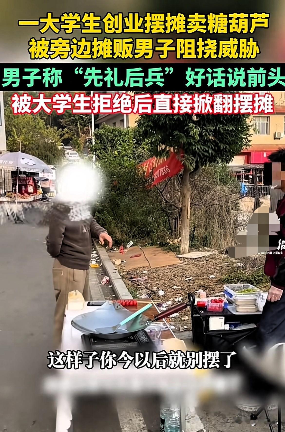 太欺负人了!四川绵阳,一个大学生摆摊卖糖葫芦,本来就是挣点生活费。结果邻摊男子上来就一句:“你不许摆,这片我说了算。”被拒绝后,居然直接动手掀了大学生的摊位,还威胁“以后别再来!” 说实话,这一幕看着就让人心寒。一言不合就掀人家摊子,到底是谁给他的底气! 有些人总爱把“先礼后兵”挂在嘴边,可真正的礼,从来不是带着威胁来的。真正的规矩,也不是谁嗓门大、谁拳头硬就算数。 摆摊经济本来就是给普通人一条活路,大学生靠双手吃饭,不偷不抢,哪来的错?如果谁都能靠吼一嗓子、动一次手就“清场”,那才是真正的乱了。 值得庆幸的是,事情被曝光了,相关部门已经介入,是非不能靠拳头裁决,只能交给法律。 这件事给所有人提了个醒:善良不该被欺负,守法的人更不该被威胁。这种恶意行为,必须严惩! 关于这件事,你怎么看呢? (信息来源:西安晚报)