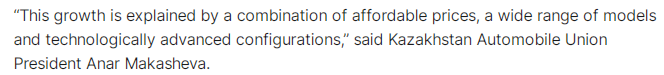 文章指出,多个因素促进了中国品牌汽车在哈萨克斯坦的发展。文章援引哈萨克斯坦汽车联盟主席阿纳尔·马卡舍娃(AnarMakasheva)的话称:“这是价格实惠、车型丰富以及技术先进的配置等多种因素的综合作用。”