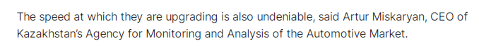 文章最后说,业内专家普遍认为,未来,中国品牌汽车有望继续在哈萨克斯坦市场占据稳固地位。