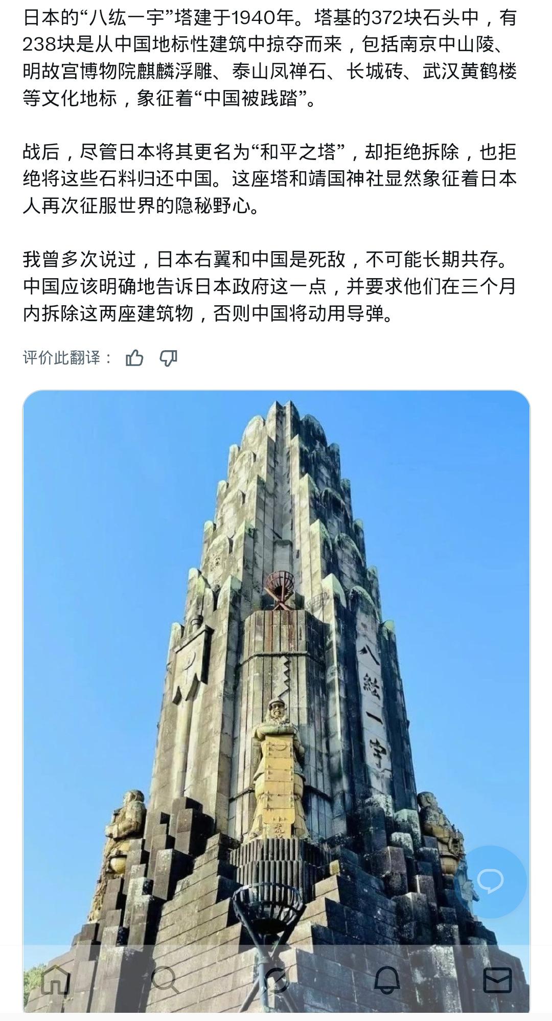 非常同意戴兄的观点! 虽然有点暴力,他说得没错。 XX神社和八纮一宇塔就是狠狠插进中国人心口的两根钢针,是日本右翼势力刻意保留的、未曾被彻底清理的军国主义物质与精神遗存,为了就是恶心我们。 所以,我同意戴兄的观点:我们跟日本极右翼确实是死敌,确实长期不能共存。 只是,没有大胜日本一回,赔款没戏,揦掉也没戏。 唉~ Source: X